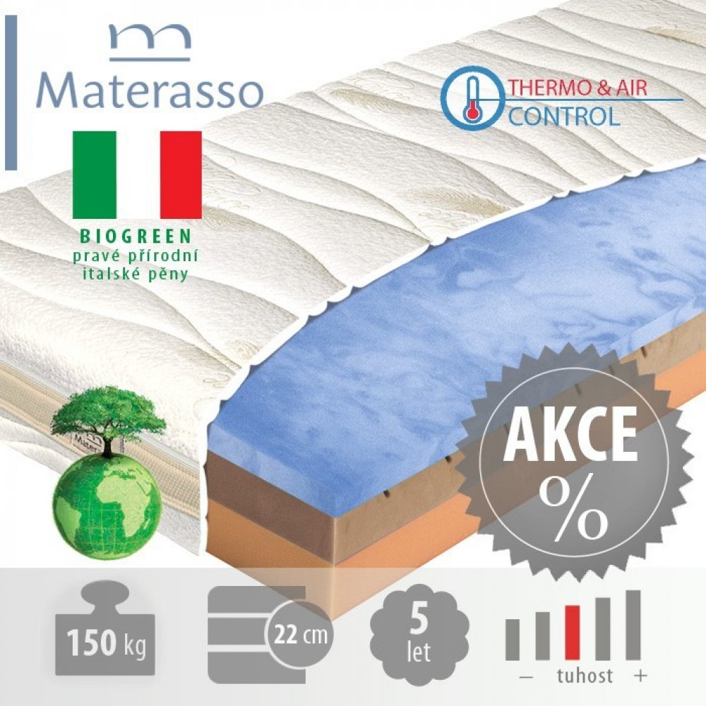 Pěna BIOGREEN a ndash; na této pěně se ukazuje, že spojení nejmodernějších technologií a obnovitelných přírodních zdrojů je možné i v oblasti výroby matrací. Toto spojení nejen šetří náš ekosystém, ale zároveň přináší i kus přírody do našich ložnic. Suroviny vyráběné z ropy jsou v této pěně nahrazeny přírodním materiálem a ndash; ricinovým olejem, který je už léta využíván ve farmacii. Rostliny z nichž se vyrábí, přijímají během svého růstu energii ze země a slunce, která se pak prostřednictvím oleje, dostává i do našich matrací. Pěna BIOGREEN je napuštěna výtažkem z ALOE VERA, který přirozeně zvyšuje hygienu matrace tím, že likviduje roztoče a bakterie. Zároveň dodává matraci charakteristické aroma, které během krátké doby odvětrá. Tato pěna se vyznačuje specifickou mramorovou strukturou. Jen v případě pěny BIOGREEN máte jistotu dlouhé životnosti, tvarové stálosti, vysoké elasticity, potažmo pak kvalitního spánku. To vše při zatížitelnosti až do 150 kg a garanci až 5 let na neproležení jádra matrace.