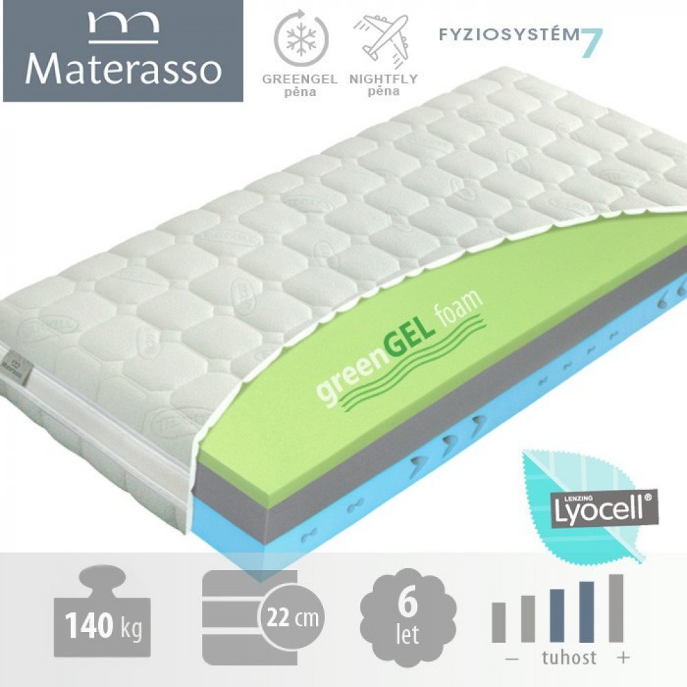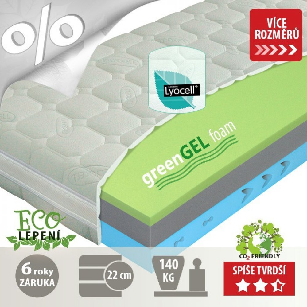 Vrchní profil: pěna GREENGEL - z výzkumu koloidních systémů se zrodily pěny Polargel a Greengel. Jedná se o zcela netoxické pěny bez jakýchkoliv nestálých těkavých substancí. Polargel a Greengel pěny jsou svěží a chladivé. Jsou vysoce elastické a maximálně komfortní. Při použití jako vrchní vrstva jádra matrace zajistí tyto pěny neopakovatelný pocit svěžesti. Jsou obzvlášť vhodné pro použití v kombinaci s viscoelastickou „línou“ pěnou, kde úplně eliminují její hřejivost. Spánek na matraci s pěnami Polargel a Greengel bude jedinečnou osvěžující relaxací.