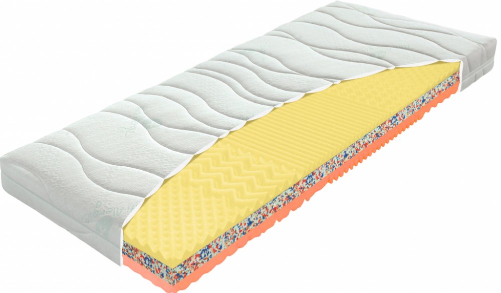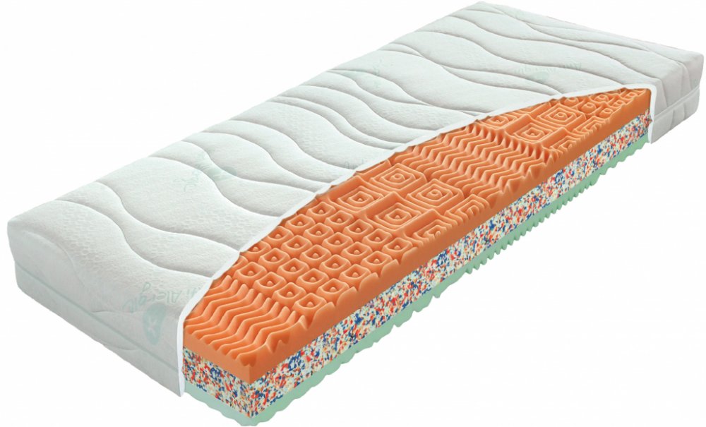 Horní vrstvy jsou z pěn Eliocell a paměťové pěny VISCO. Měkčí strana z paměťové pěny vás na lůžku příjemně obejme. Naopak PUR pěna je pružná a má tvarovou stálost. Pěny jsou tvarované do masážních nopů. I přes potah vám prokrví pokožku a uvolní svaly, takže se ráno probudíte odpočatí. Navíc umožní matraci lépe dýchat a odvádět přebytečné teplo.