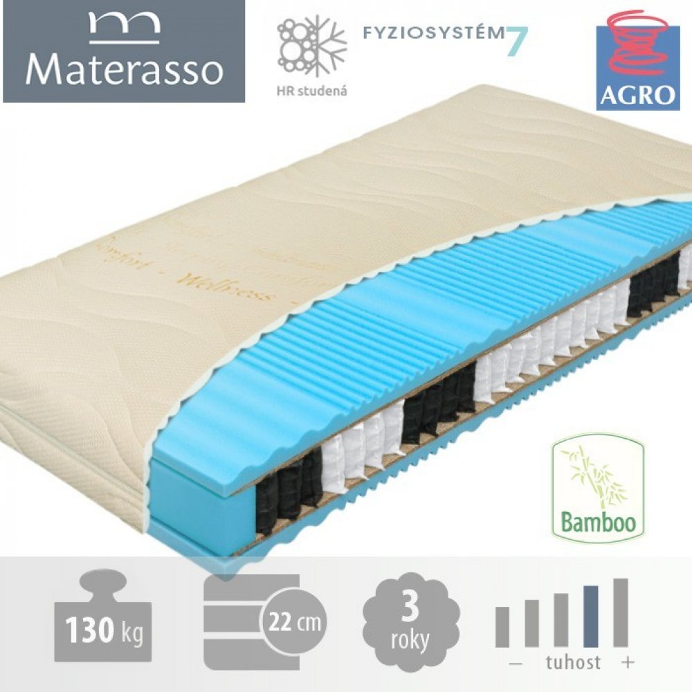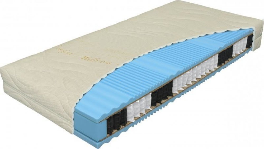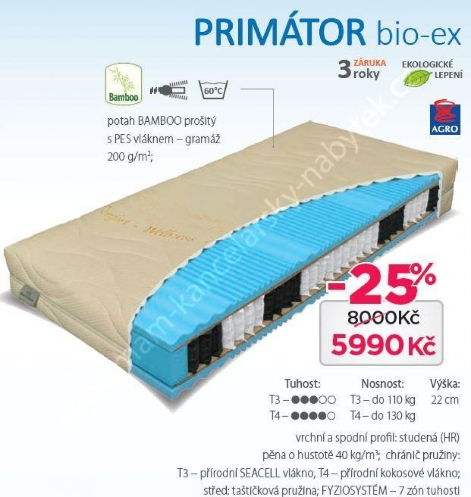 Matrace s taštičkovou pružinou PRIMÁTOR bio ex je vhodná na pevné rošty. Každá pružina je uložená v tašce, která ji umožňuje samostatné kopírování. Přináší lepší ortopedickou podporu páteře, a to díky většímu počtu pružin a jejich rozložení do 7 zón tuhosti. Vrchní a spodní profil je tvořen studenou HR pěnou o hustotě 38 kg/m3. Střed tvoří taštičkové pružiny. Chránič pružiny je zhotoven z přírodního kokosového vlákna. Potah Aloe vera prošitý PES vláknem. Speciální potah obsahuje převážně enzymy, minerální látky a aminokyseliny, které příznivě působí na pokožku a napomáhá jí k regeneraci a čištění. Potah je snímatelný a pratelný na 60°. Fyziosystém matrace je tvořen 7 zónami tuhosti. Tuhost matrace je T4. Maximální nosnost do 130 kg. Výška matrace 22 cm. Nevhodné pro lamelové a polohovací rošty.