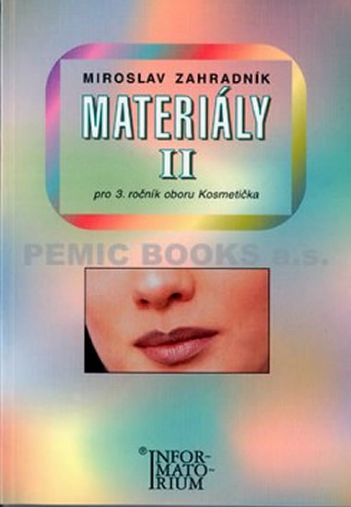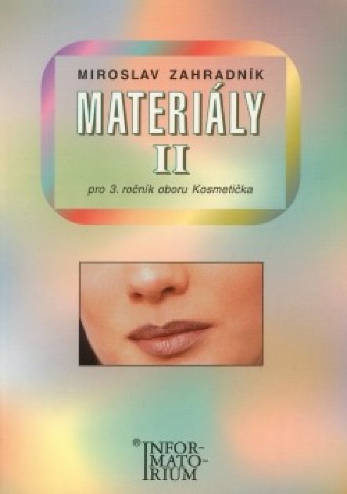 Publikace: Materiály II - Pro 3. ročník UO Kosmetička - Zahradník Miroslav. Pro 3 ročník UO Kosmetika Přehledně popisuje kosmetické přípravky k čištění pleti, přípravky vyhlazující pokožku, přípravky k líčení, depilaci, epilaci a dezinfekci, pro pedikúru, přípravky k čištění zubů a k mytí vlasů. Publikace: Materiály II - Pro 3. ročník UO Kosmetička - Zahradník Miroslav.