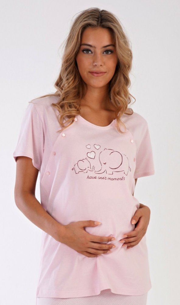 Mateřské pyžamo se sloníky - pohodlné tričko, s krátkým rukávem, je na přední straně s obrázkem sloníků - máma a malé slůně a nápis: Have one´s moments. Oboustranné rozepínání - pro pohodlné kojení. Kalhoty jsou dlouhé, mají v pase gumu i šňůrku ke stažení.