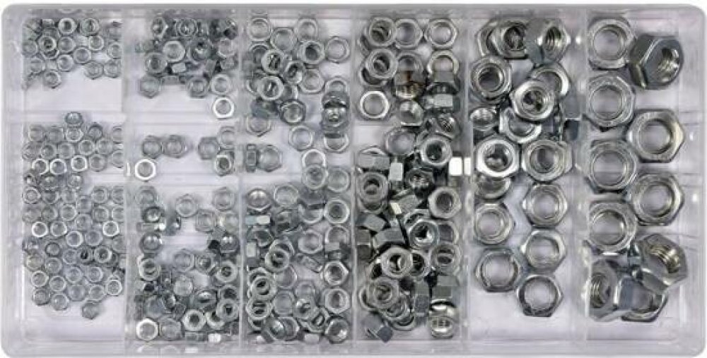 Typ závitu: metrickýMateriál: železoPovrchová úprava: pozinkovanéRÁMUS: 934Počet kusů v sadě: 300Sada 300 kusů metrických matic obsahuje velikosti M3, M4, M5, M6, M8, M10. Celá věc byla umístěna ve vhodném obalu typu "sorter".