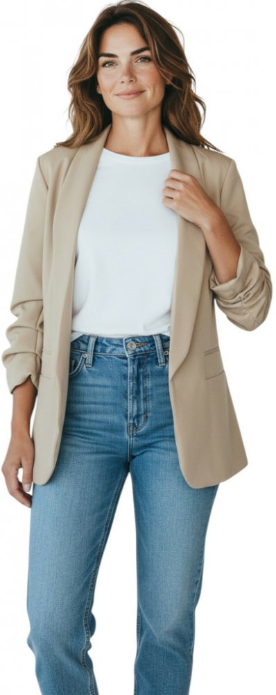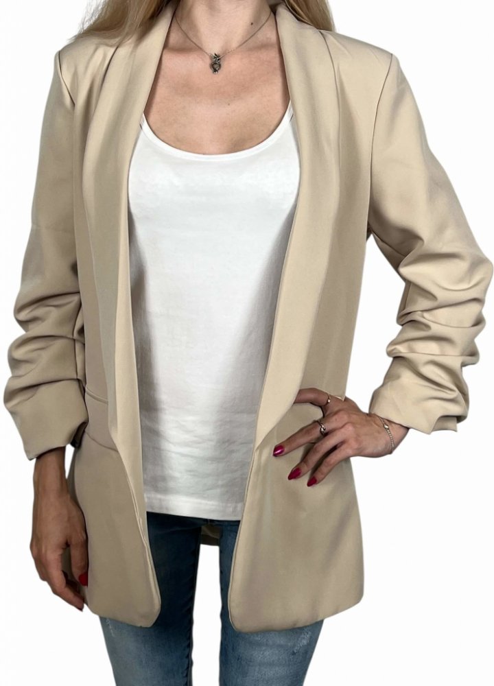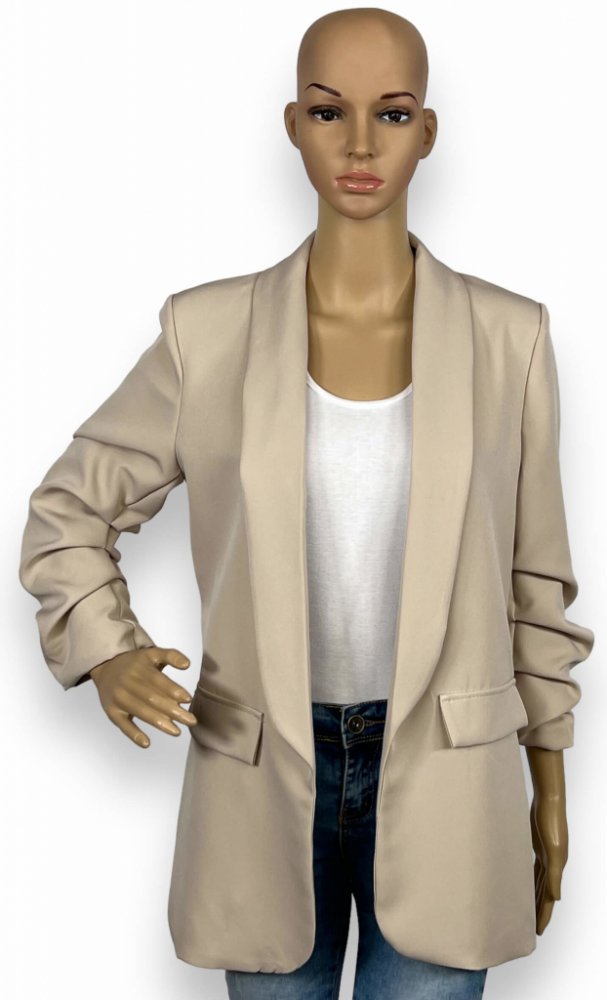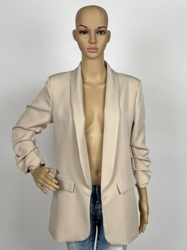 Toto elegantní dámské sako béžové barvy skvěle doplní každý váš outfit. Hodí se jak do kanceláře, tak na příležitosti, kdy chcete vašemu modelu dodat ležérní eleganci.