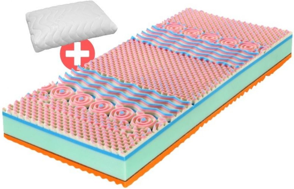 Vysoká, robustní matrace s paměťovou pěnou a pružnou pěnou Flexifoam®. Technologie 3D Rainbow zaručuje, že z každé použité pěny vytěžíte maximum komfortu. Pratelný potah s bambusovým vláknem. Celkově středně tuhá s rozdílnou tuhostí stran. 7-mi zónová matrace s 3D Rainbow technologií obsahuje po celé ploše VISCO paměťovou pěnu, která zajišťuje odlehčení páteře a přizpůsobuje se tělu dle absorbovaného tepla a zatížení. Masážní profil ložných ploch (prokrvení svalů a pokožky). Jedna strana matrace je vyztužena kokosovou deskou pro dodatečnou tuhost a vzdušnost. Polštář s paměťovou pěnou zdarma! Do vyprodání zásob: ke každé matraci Tony, luxusní paměťový polštář Monte Carlo v ceně 490Kč ZDARMA! Automaticky Vám ho přibalíme k objednávce :-) Extra výška 25cm a různě tuhé strany Výška matrace Tony je exklusivních 25cm, navíc 7-mi zónová profilace s 3D Rainbow technologií obsahuje po celé ploše VISCO paměťovou pěnu, která zajišťuje odlehčení páteře a přizpůsobuje se tělu dle absorbovaného tepla a zatížení. Na obou stranách matrace Tony je použit příjemný masážní profil ložných ploch pro prokrvení svalů a pokožky. Druhá (oranžová) strana matrace je vyztužena kokosovou deskou pro dodatečnou tuhost a vzdušnost.Tvrdší Strana HARD (kokos-latexová výztuha + oranžová pěna Flexifoam) Měkčí strana SOFT (strana s visco paměťovou pěnou s technologií 3D Rainbow) Luxusní potah s bambusovým vláknem Smetanový potah s jemným vzorem s povrchovou úpravou vláken Bamboo pro rychlejší schnutí. Jemný na dotek, prošívaný klimatizačními vrstvami dutých vláken. Polyesterová vlákna, dvojdílná konstrukce (zip kolem dokola – potah z 2 částí pro snadnou manipulaci). Pratelný na 60 °C. Parametry matrace Tony Výška: 25cmNosnost: 150kg / osobaTuhost: středně tvrdá (3)Složení: PUR pěny Flexifoam / paměťová pěnaZáruka: 5 let / testováno mechanickými zátěžovými testy (80.000x) Dostupné rozměry 195x80, 195x85, 195x90, 200x80, 200x90, 200x100, 200x120, 200x140, 200x160, 200x180cmOstatní rozměry vyrobíme na míru dle požadavku - poptávejte zde Balení Matrace pečlivě balíme do několika vrstev pevného igelitu, aby k vám dorazily čisté. U této matrace je balení nekomprimované, čili matraci můžete po vybalení ihned použít. Náš názor: "exklusivní výška 25cm, bytelnost, komfort a navíc nosnost 150kg"