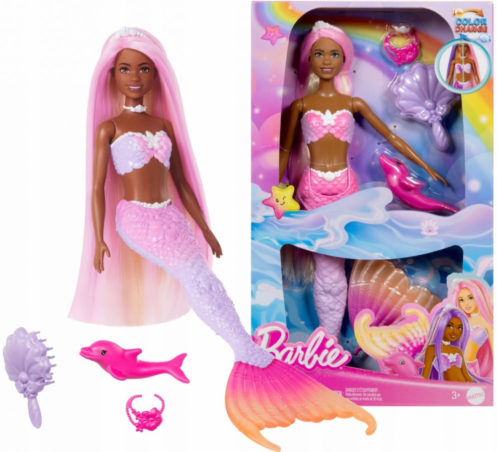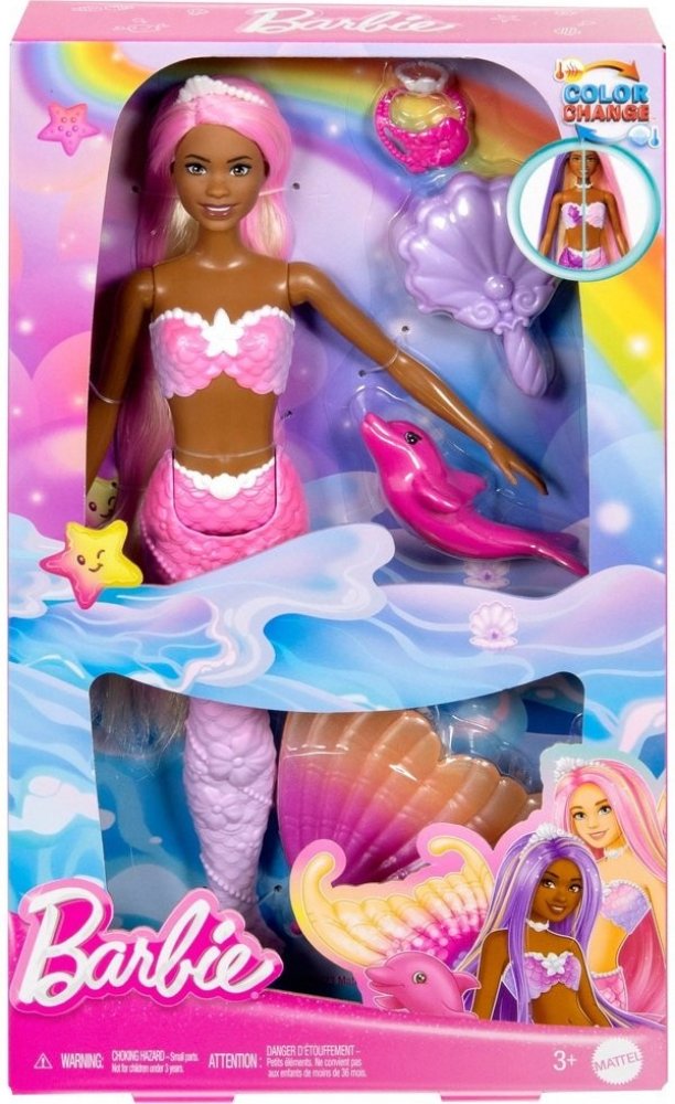 Panenka Barbie potěší každé dítko a společně si užijí spoustu her a zábavy. Zajímavé provedení podtrhuje také vícebarevné provedení vlasů. K výrobě panenky slouží plast. Panenka Barbie Mořské panny je vysoká 33 cm. Panenka udělá radost dětem od 3 let. Klíčové přednosti produktu Barbie a dotek kouzla - Mořská panna Brooklyn Panenka Barbie Mořské panny patří k nejoblíbenějším dětským hračkám Nadchne...