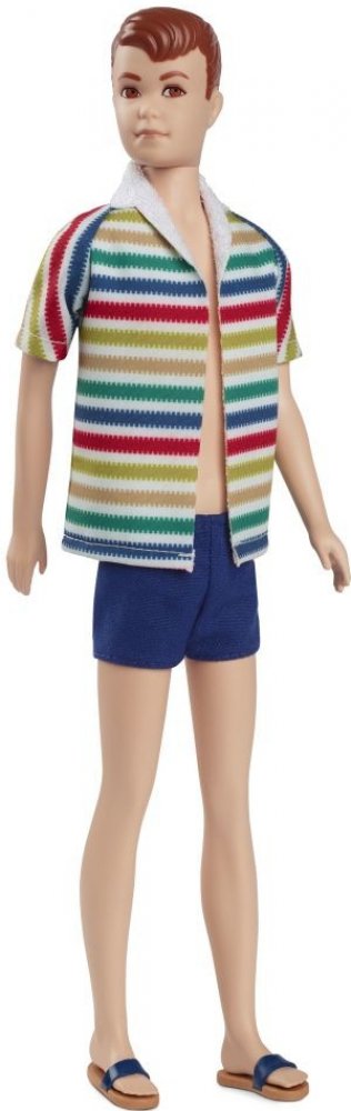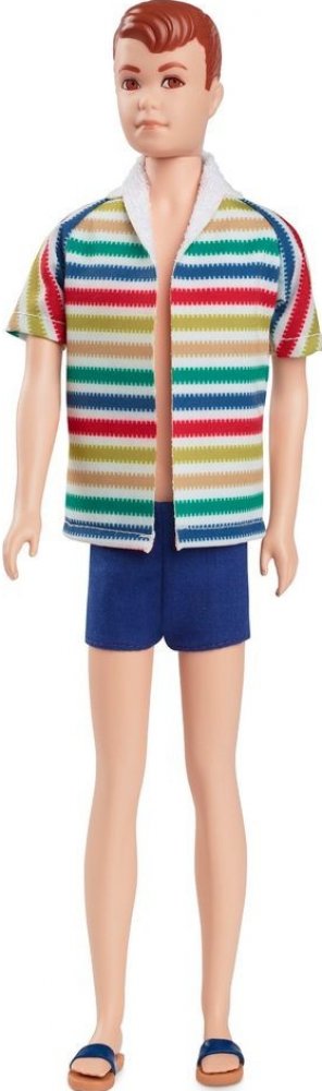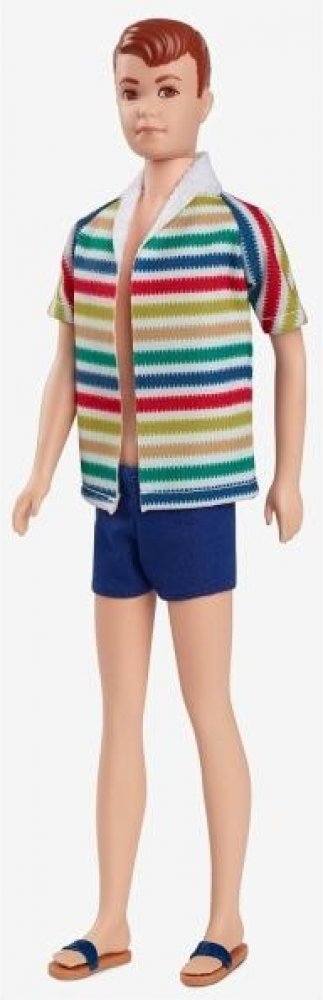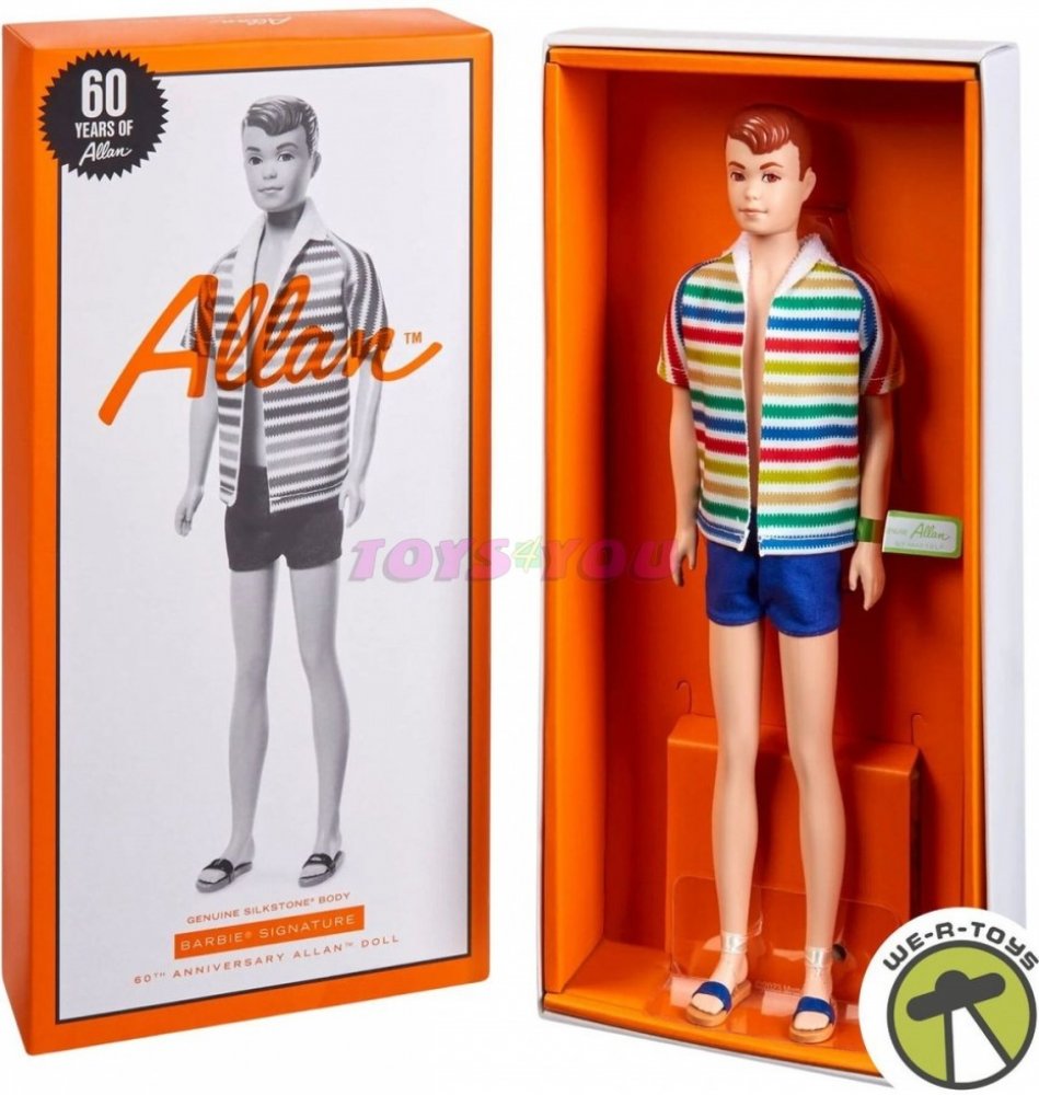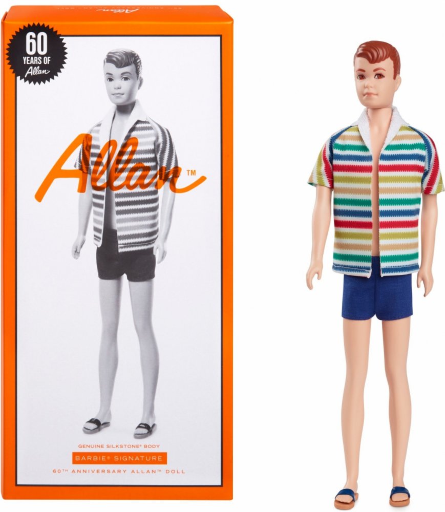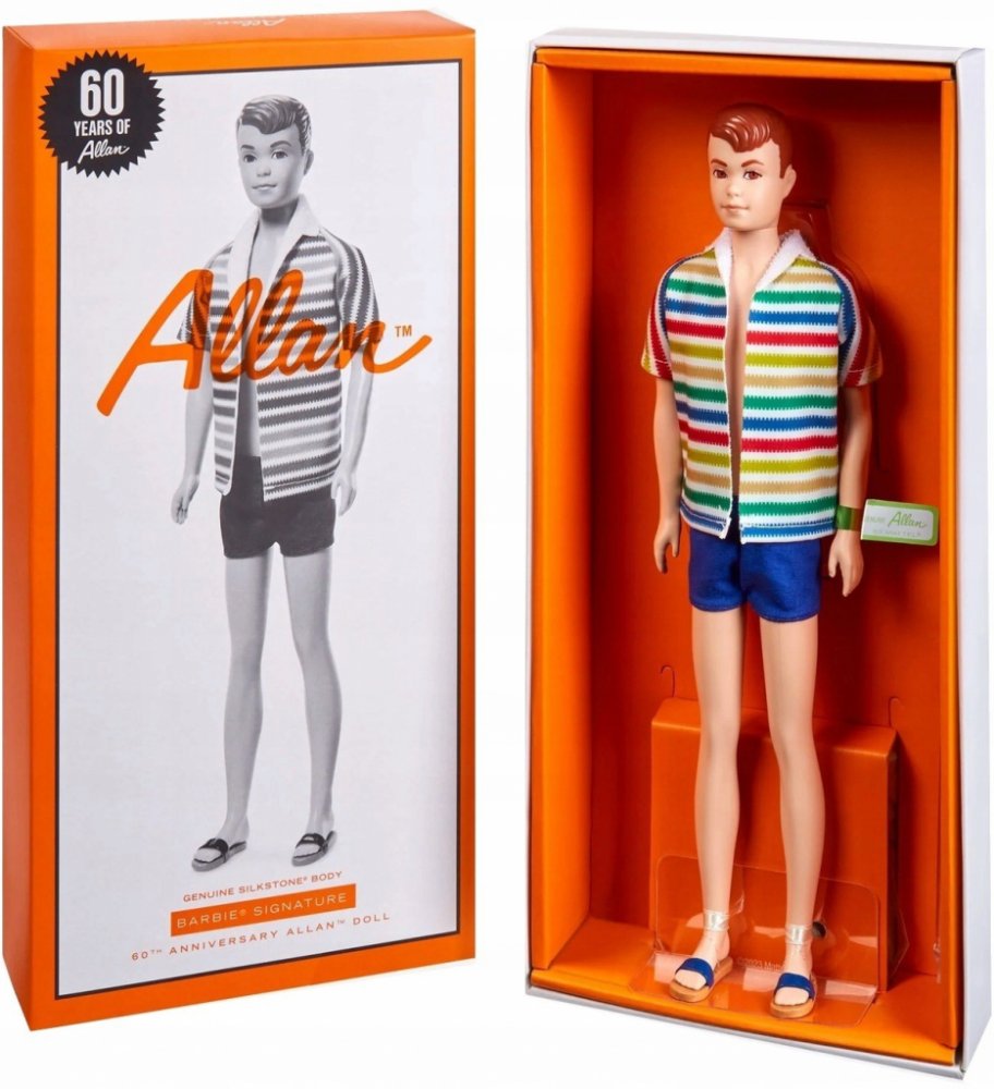 V roce 1964 Mattel představil světu Kenova kamaráda Allana. Na oslavu 60. výročí této příznivé příležitosti jsme vytvořili tuto sběratelskou reprodukci Silkstone nádherného plážového vzhledu panenky Allan: barevnou pruhovanou bundu s plavkami v námořnické modři a odpovídajícími sandály. Má také vytvarované zrzavé vlasy a vintage visačku na zápěstí, stejně jako originál.