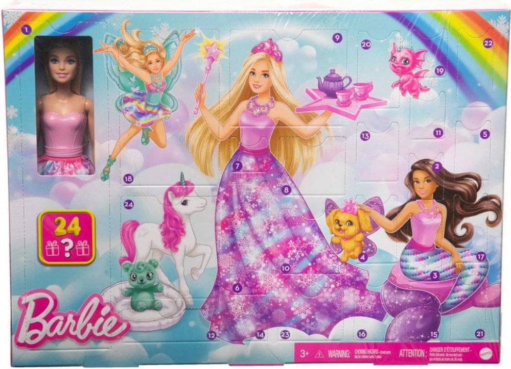 Rozměry balení cca 45 x 33 x 5 cm (d x v x š).Přidejte fantazii do svátků s Barbie adventním kalendářem s dárky s fantasy tématikou! Po dobu 24 dní otevírejte jedno překvapení denně (nebo někdy všechny najednou!) a užijte si superzábavné rozbalování. První den děti objeví růžovovlasou panenku Barbie a poté módní a výmluvné doplňky, které se s přibývajícími odhaleními promění v mořskou pannu, králo...