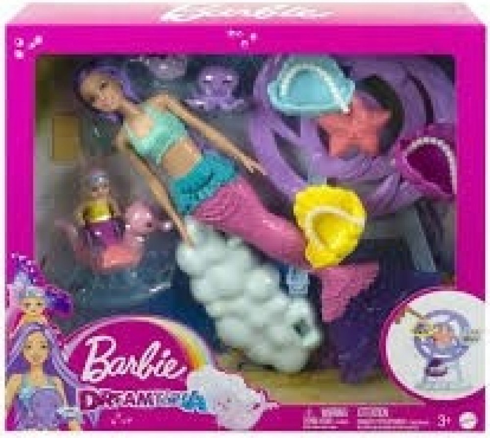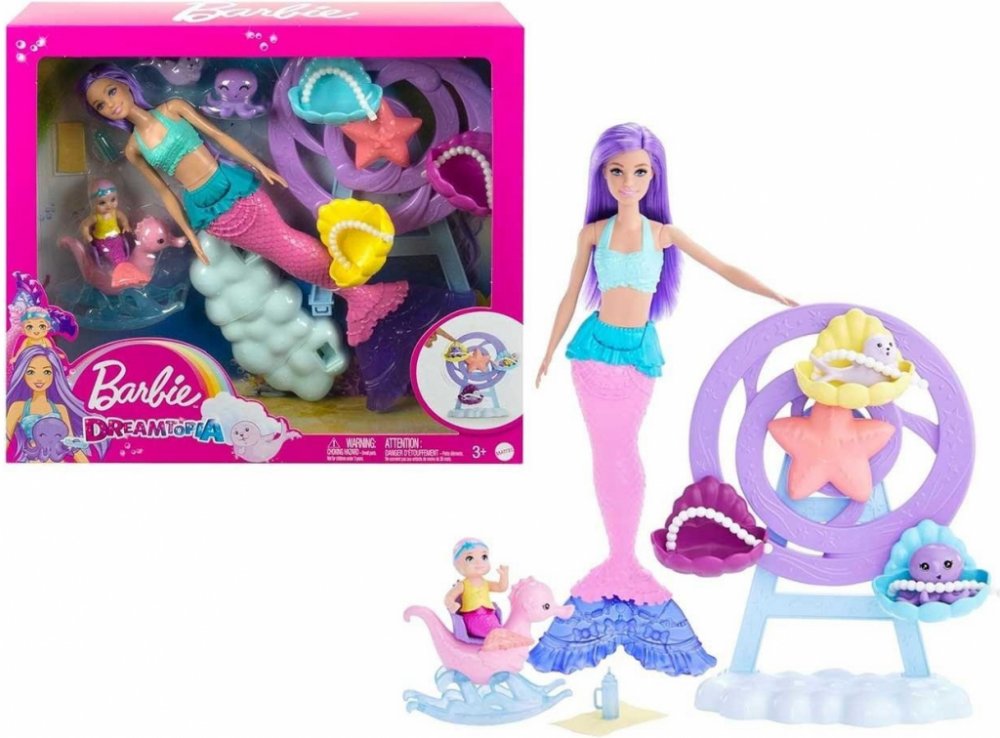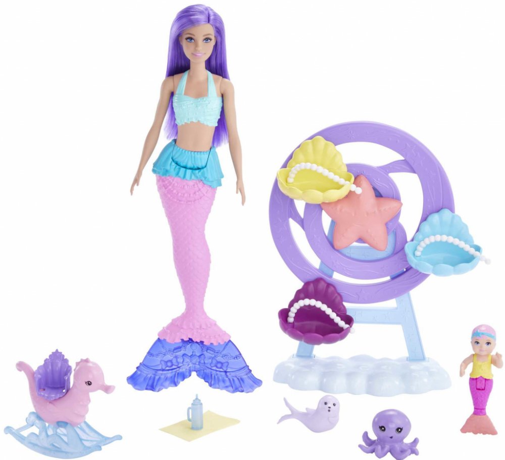 Ponořte se do vyprávění s touto pohádkovou herní sadou Barbie® s podmořskou tématikou! Panenka Barbie® mořská panna má rovné levandulové vlasy a krásně detailní růžový a fialový ocas. Je připravena postarat se o malou mořskou pannu, chobotnici a tuleně s příslušenstvím, které zahrnuje kolotoč inspirovaný ruským kolem, houpacího mořského koníka, láhev a deku. Panenka Barbie® neumí plavat ani stát s...
