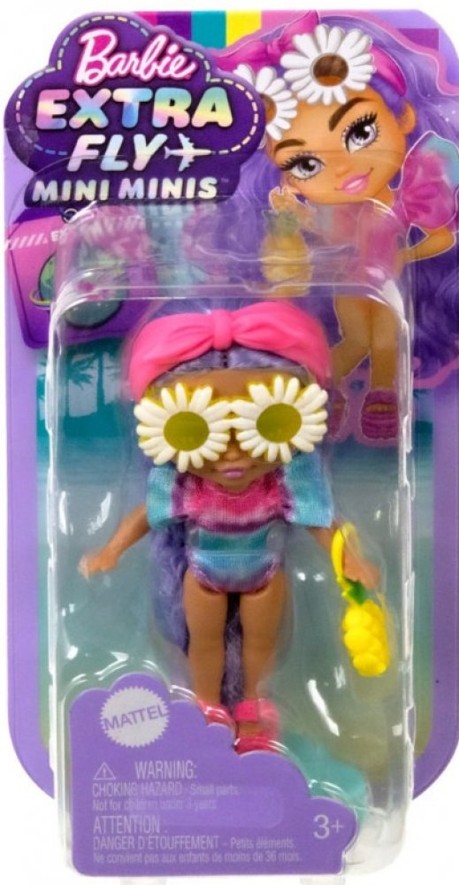 Tato panenka z kolekce Barbie Extra Mini Minis měřící 8 cm je nejmenší členkou Barbie Extra Fly týmu a připravena na plážový odpočinek v jedinečném stylu! Má dlouhé levandulové vlasy a zářivý tie-dye plavkový oblek s puff rukávy. Své plážové oblečení doplňuje růžovou čelenkou, slunečními brýlemi s motivem sedmikrásek, kabelkou ve tvaru ananasu a masivními sandálky. Panenka dodává inspiraci pro m...
