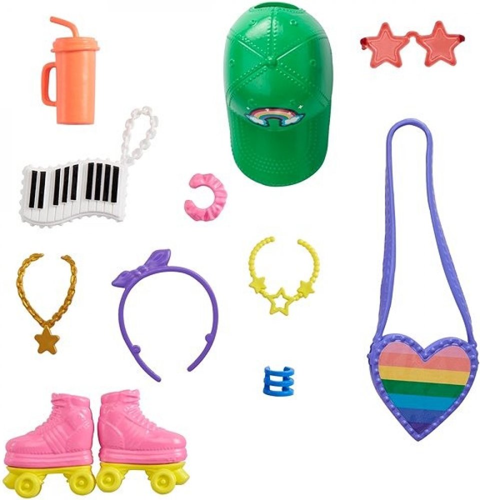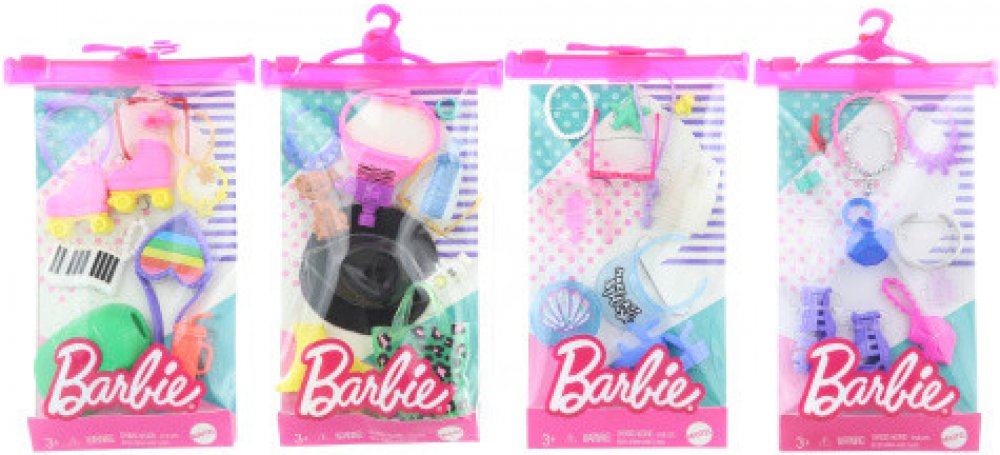 Tyto sady doplňků pro panenky Barbie® inspirují styling a vyprávění příběhů s 11 kusy - vyberte si z motivů inspirovaných kolečkovými bruslemi, oceánem, divokou přírodou a dívčí nocí. Mezi tyto položky patří módní doplňky, jako jsou klobouky a peněženky, a také zábavné příběhové kousky, jako jsou kolečkové brusle nebo hvězdice.