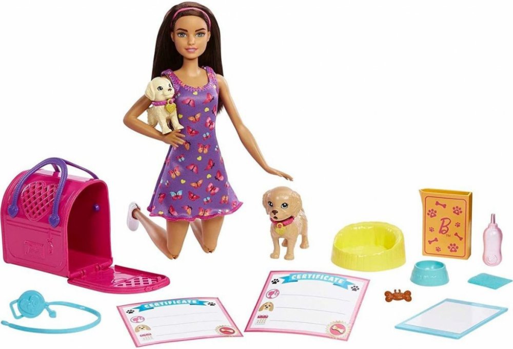 Herní set Barbie™ Panenka s pejsky podněcuje dětskou lásku ke zvířátkům a pečovatelské instinkty. Tento herní set obsahuje panenku Barbie® a roztomilá štěňátka k adopci s funkcí přeměny barvy - děti mohou dát velkému štěňátku napít ledovou vodu z láhve a sledovat, jak čůrá na podložku pro štěňata, a nebo mohou "krmit" malé štěňátko a sledovat, jak se mu mění barva tlamičky. Mezi další vypravěčské doplňky, které podporují pečovatelskou hru, patří přenosná taška pro domácí mazlíčky, pelíšek, adopční certifikáty a další! Panenka neumí samostatně stát. Barvy a vzhled výrobku se mohou lišit.