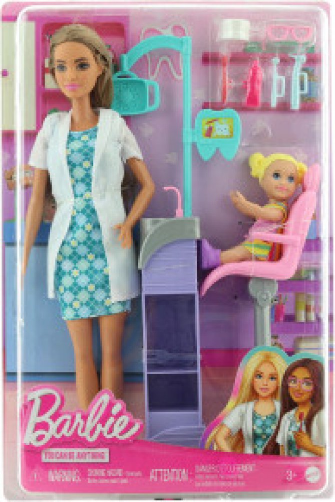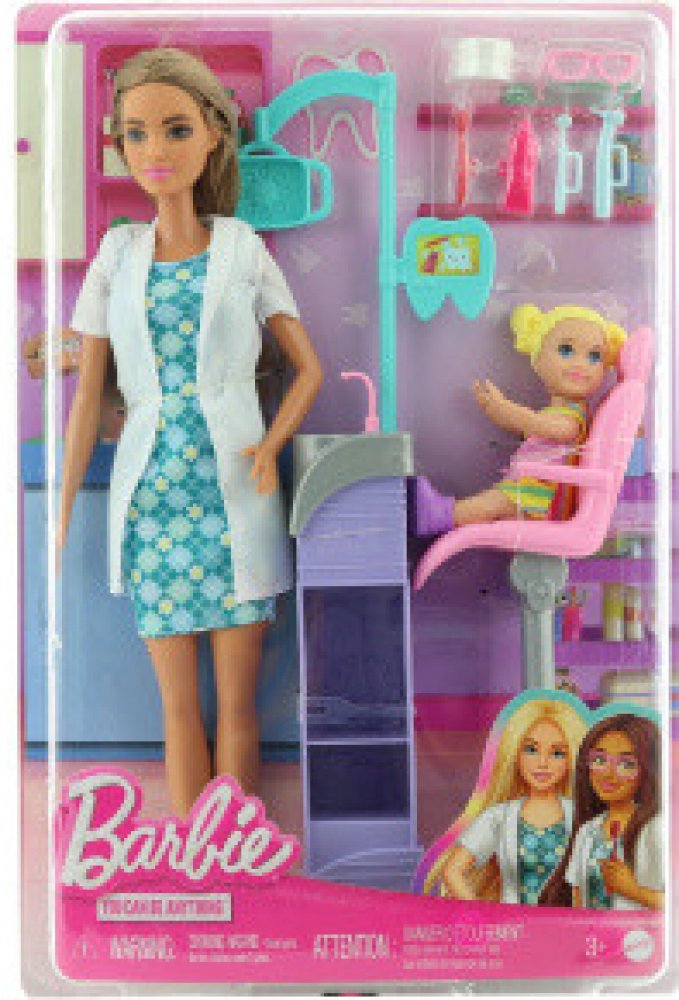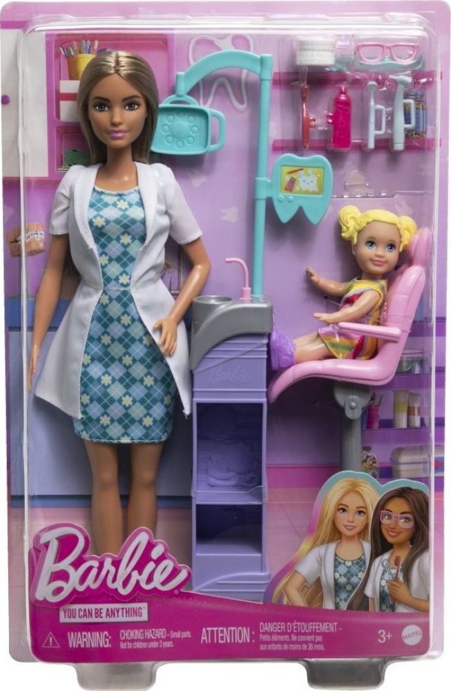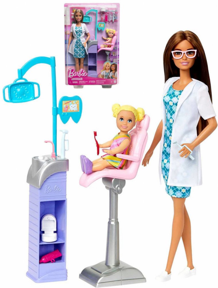 Objevte svět zábavy při hraní si na různá povolání s herními sety Barbie! Když si holčička hraje s Barbie, představuje si, čím vším se může stát, a tento herní set jí umožňuje prozkoumat povolání zubařky! Panenka Barbie zubařka má na sobě modré šaty a bílý plášť a je připravena postarat se o svou malou pacientku. Součástí herního setu je zubařské křeslo, souprava na vyplachování úst a šest dalších doplňků. Děti si zamilují nekonečné možnosti kreativního vyjádření a zábavy při vyprávění příběhů! Obsahuje panenku Barbie s hnědými vlasy. Panenka nemůže stát samostatně. Barvy a provedení se mohou lišit.