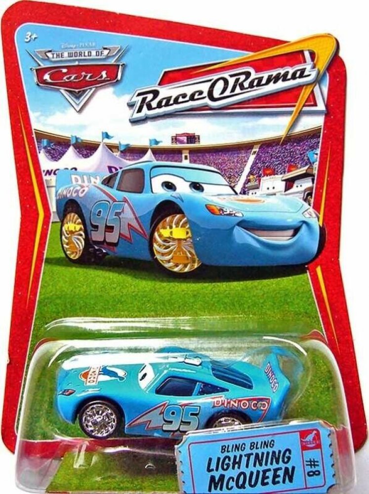 Kovový model autíčka Dinoco Lightning McQueen (Blesk Dinoco) z filmu CARS (Auta). Autíčko ze série Race O Rama - jedna z prvních sérií modelů CARS.Klasický Blesk McQueen, tentokrát však v barvách teamu Dinoco, za který závodil King. Lightning McQueen (Blesk McQueen) je závodník sponzorovaný firnou Rust-eze Medicated Bumper Ointment ("S pouhou troškou Rust-Eze, můžete vypadat jako Blesk McQueen!"). Lightning McQueen (Blesk McQueen) má ve filmu číslo 95. Na začátku filmu jede svůj první závod Piston Cup v Nashville, Tennessee a vítězí. Zpočátku je McQueen (Blesk) na každého nepříjemný a hrubý, ale jedné noci na cestě do Los Angeles v Kalifornii se stane, že se ve spánku náhodou oddělí od svého tahače Macka poté, co čtveřice vytuněných aut - Boost, Wingo (Spojlík), Snot Rod (Smrkáč) a DJ narazí do Mackova přívěsu, což způsobí Bleskovo vypadnutí z tahače. Když se McQueen (Blesk) probudí všimne si, že Mack je pryč. Snaží se jet jak to jde, aby Macka dohonil, téměř se srazí s vlakem a nakonec nechtěně skončí v Radiator Springs (Kardanová Lhota) kde nešťastnou náhodou poškodí hlavní silnici a je zatčen šerifem, který pak řekne: "Chlapče, jsi v průšvihu." Druhý den ráno je McQueen (Blesk) postaven před soud. Soudce Doc Hudson ho chce nejprve dostat co nejrychleji z města, ale i díky namyšlenosti a aroganci Bleska se nakonec rozmyslí a McQueen (Blesk) je nucen zůstat a za trest musí opravit silnici. Během oprav silnice, které se McQueen (Blesk) snaží provádět se postupně dozvídá spoustu nového o Radiator Springs (Kardanová Lhota) a obyvatelích, kteří zde žijí. Spřátelí se s odtahovým autem jménem Mater (Burák) a zamiluje se do sportovního auta jménem Sally Carrera, která v městečku vlastní Cozy Cone Motel. McQueen (Blesk) po čase zjistí, že Doc Hudson je vlastně bývalý závodník, jehož kariéra skončila jednoho dne, kdy měl vážnou nehodu. Předtím se ale stal čtyřikrát vítězen Piston Cupu, díky čemuž byl Radiator Springs (Kardanová Lhota) kdysi velice populární turistickou atrakcí, ale kvůli výstavbě dálnice Interstate 40 nakonec popularitu toto městečko ztratilo a téměř se na něj zapomnělo. Po opravě silnice se McQueen (Blesk) rozhodne zůstat v Radiator Springs mnohem déle a pomoci všem, kteří pomoc potřebují. Jenže jeho tahač Mack, společně s několika reportéry ho najdou a přesvědčí ho, aby se zúčastnil závodu v Los Angeles. Během závodu použije Lightning McQueen (Blesk) několik triků, které ho naučil Doc Hudson (nyní šéf jeho týmu), když spolu trénovali na Willy's Butte. Na konci filmu, poté co prohrál závod z dobrých úmyslů (pomohl zraněnému Kingovi dojet do cíle) dostal McQueen (Blesk) nový nátěr. Stále ale závodí za tým Rust-Eze, přestože na začátku filmu se chtěl stát členem týmu Dinoco, který mu členství po závodě také nabídl.