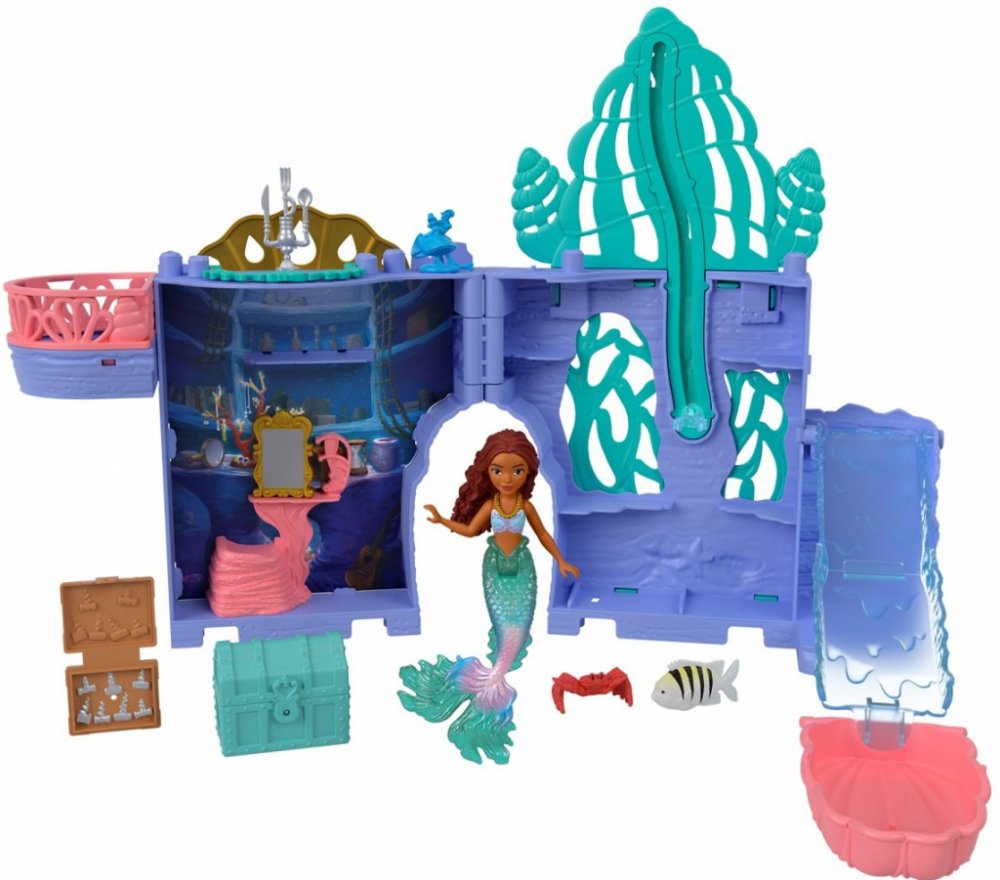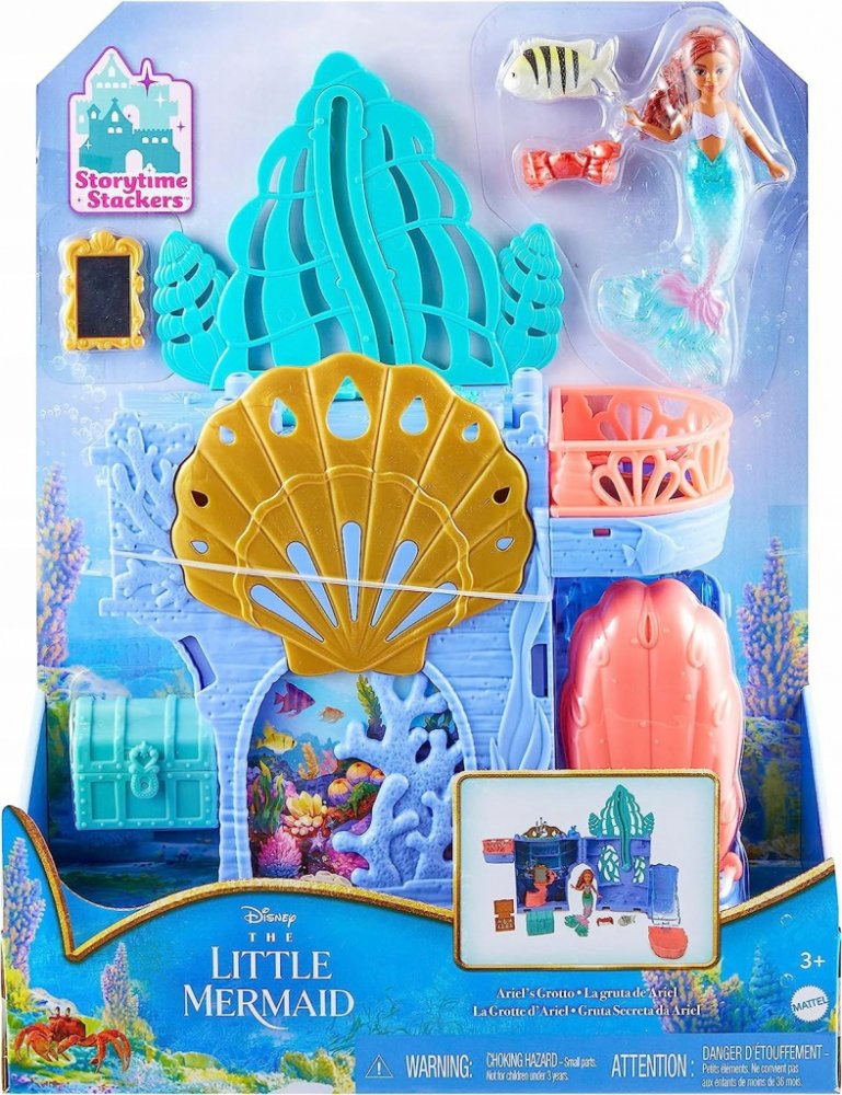 Ponořte se do vyprávění příběhů s hrací sadou Malé mořské víly od Disney inspirovanou vzrušujícím filmem v kinech! Herní sada a panenka Ariel Story Stackers™ Grotto, inspirovaná pohádnou od Disneyho, Malá mořská víla, potěší fanoušky tím, že oživí toto kouzelné podvodní místo. Kompaktní sada se otevírá a odhaluje podvodní hangout v okouzlujícím malém měřítku s několika hracími plochami, včetně bazénu a výtahu. S malou mořskou vílou Ariel, figurkami Floundera a Sebastiana a dalším příslušenstvím může fantazie plynout hned po vybalení z krabice! Hrací sada obsahuje rukojeť pro hraní na cestách a lze ji propojit s dalšími herními sadami Storytime Stackers™ a rozšířit tak království. Hrací sada v malém měřítku se otevírá a odhaluje několik herních oblastí - zábavné funkce zahrnují véčkový bazén, rozkládací skluzavku a klip, který Ariel pomůže „plavat“ nahoru a dolů! S Mořská víla je okouzlující v malém měřítku se svým nádherným ocasem! Díky rukojeti je herní sada pohodlnou cestovní hračkou - stačí složit a vložit kousky dovnitř!