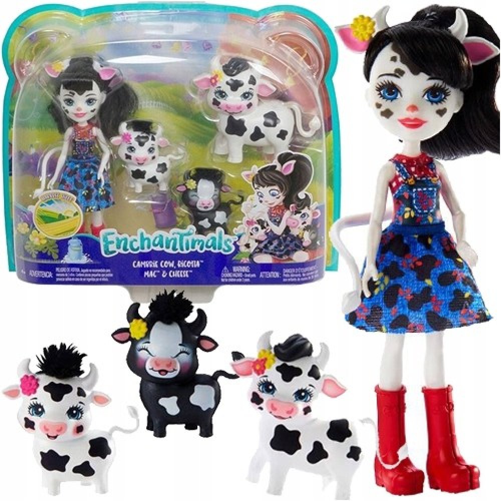 Enchantimals jsou milé postavičky, které se zvláštním způsobem pojí s nejlepšími zvířecími přáteli. Tato rodinka Enchantimals z kolekce Harvest Hill obsahuje panenku Cambrie Cow (cca 15 cm), krávu Ricottu a 2 telátka. Zvláštní pouto této kraví rodinky poskytuje dětem spoustu nápadů na hraní. Toto roztomilé stádo podporuje hraní pečujících rolí. Ve svém pracovním oblečku s odnímatelnou sukní s punt...
