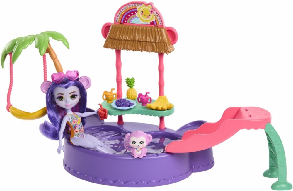 Enchantimals Tropical Pool Set + Opičí panenka Užijte si zábavu s Enchantimals u bazénu! Tato sada k bazénu ve tvaru opičky obsahuje panenku (15 cm) v rozkošném plaveckém kostýmu a přátelskou figurku opičky. Nechybí spousta herních prvků včetně palmy s houpačkou, skluzavky a stojanu na džus a zdravé občerstvení. Děti si zamilují tuto sadu, ve které si mohou hrát u bazénu se svými kamarády Enchanti...