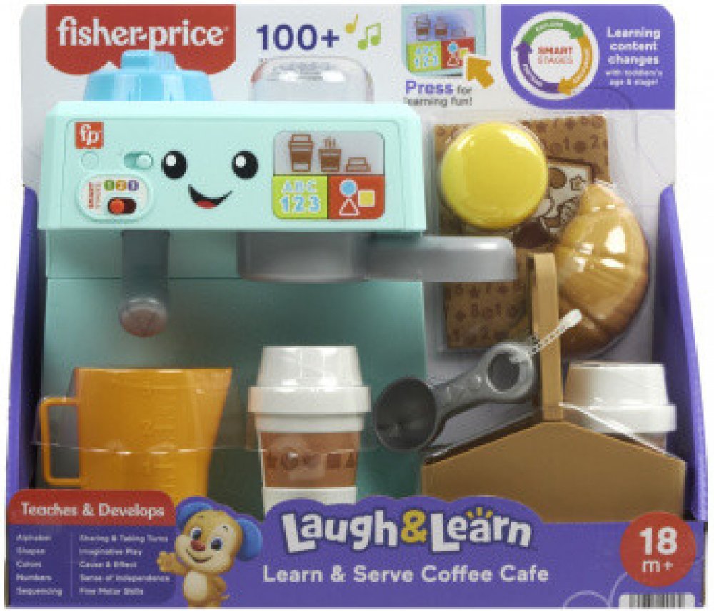 Malí baristé mohou připravovat, podávat a sdílet kávu s tímto zábavným herním setem pro batolata od Fisher-Price®! Stisknutím tří tlačítek, která učí přípravu kávy, otáčením kolečka pro napěnění nebo při plnění šálku děti aktivují více než 75 písniček, zvuků a frází! Zábavné je, když děťátko pohybuje mlýnkem na kávu tam a zpět, a vyskakují tak kávová zrna! Součástí je 9 herních doplňků: 2 kelímky ...