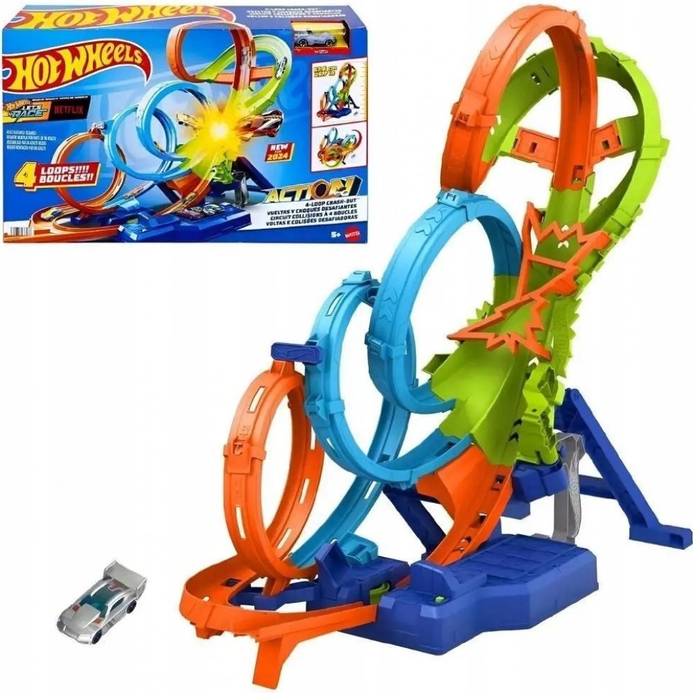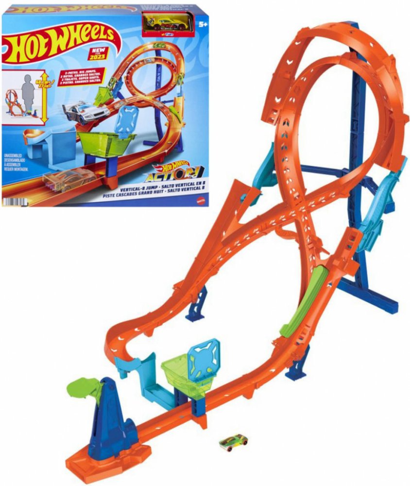 Vertikální osmičková dráha Hot Wheels měří více než 60cm a nabízí dvě různé dráhy pro kaskadérské kousky a závody. Otočením ručního přepínače si děti vyberou mezi vertikální zatáčkou a dráhou osmičky! Obsahuje jeden angličák Hot Wheels. Dráhu lze připojit k dalším setům (prodávají se samostatně).