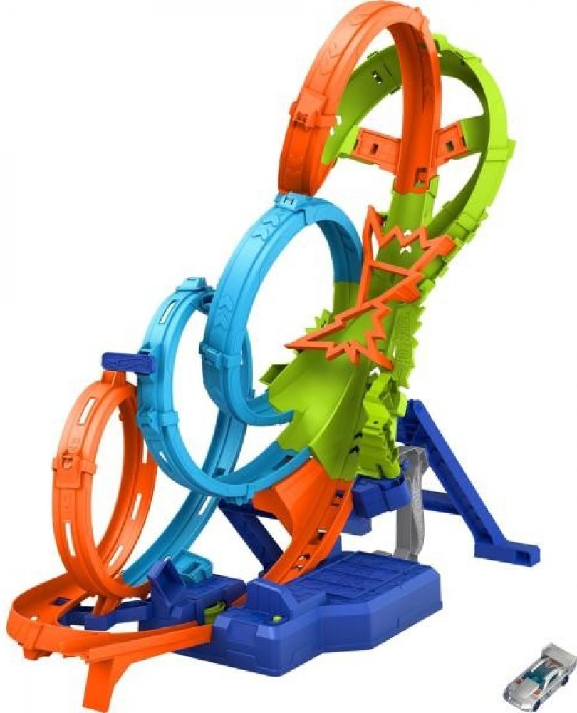 Akční vertikální závodní kaskadérská dráha Hot Wheels ve tvaru osmičky. Autíčko je součástí balení.