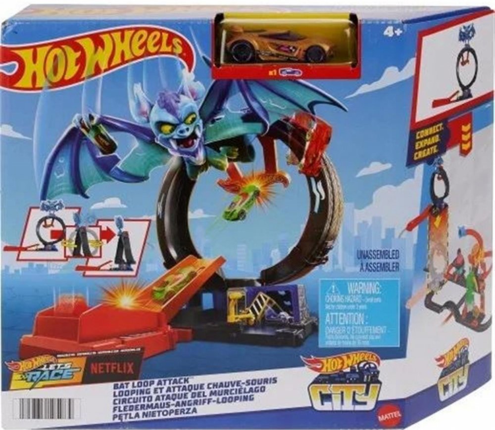 Hot Wheels Bat Loop je autodráha s nebezpečnou smyčkou a skvělým odpalovačem aut. Závodte a provádějte kaskadérské kousky, abyste porazili netopýra, který zaútočil na Hot Wheels City!