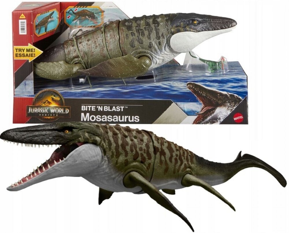 Jurský svět ožívá! Přineste si domů napětí a dobrodružství s unikátním Mosasaurusem inspirovaným filmem. Figurka měří 65 cm, má pohyblivé ploutve a ocas a nabízí akční funkce „Kousni a vystřel“. Děti mohou snadno uchopit ocas a stisknout tlačítko, čímž otevřou mohutnou čelist připravenou „kousnout“ a spolknout mini figurku Dilophosaura. Stisknutím znovu Mosasaurus kořist „vystřelí“ z tlamy ven. Skvělý dárek pro všechny fanoušky dinosaurů od 4 let! Jurský svět ožívá! Přineste si domů napětí a dobrodružství s unikátním Mosasaurusem inspirovaným filmem. Figurka měří 65 cm, má pohyblivé ploutve a ocas a nabízí akční funkce „Kousni a vystřel“. Děti mohou snadno uchopit ocas a stisknout tlačítko, čímž otevřou mohutnou čelist připravenou „kousnout“ a spolknout mini figurku Dilophosaura. Stisknutím znovu Mosasaurus kořist „vystřelí“ z tlamy ven. Skvělý dárek pro všechny fanoušky dinosaurů od 4 let!
