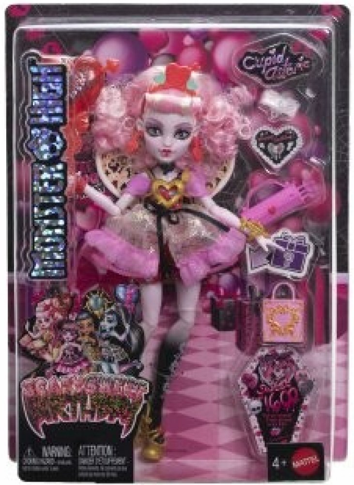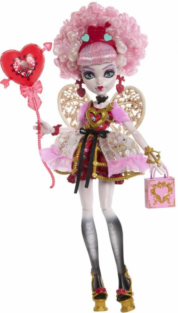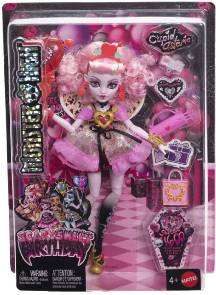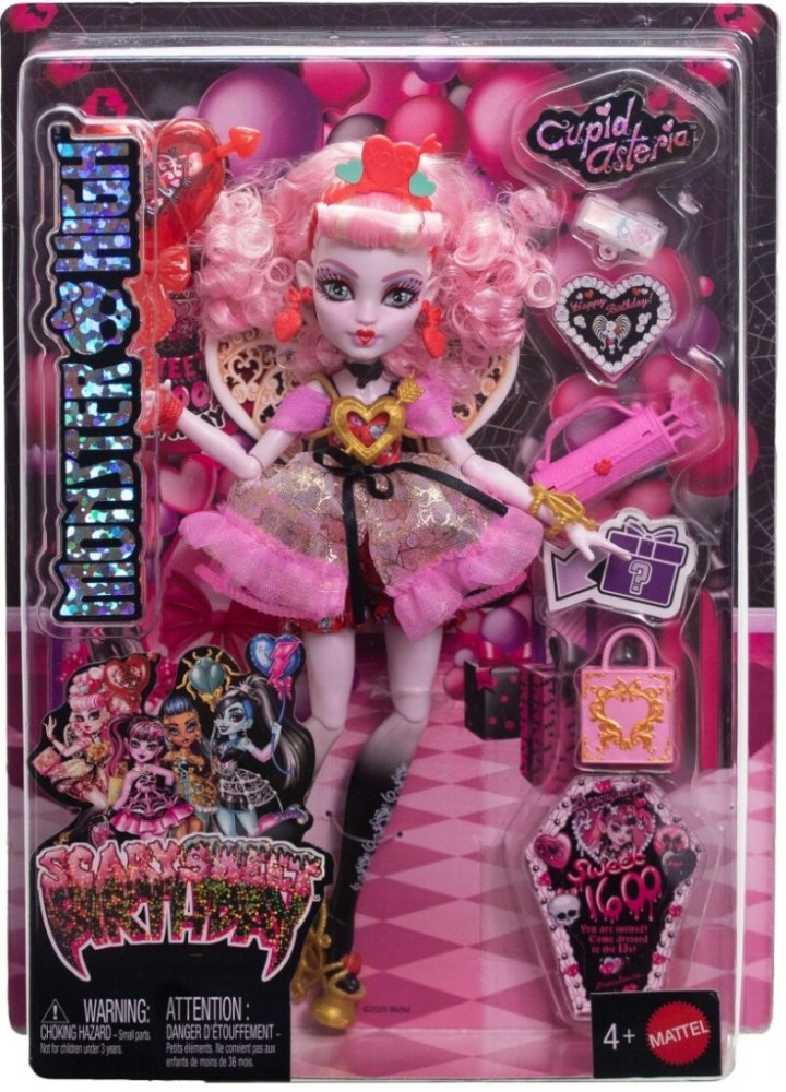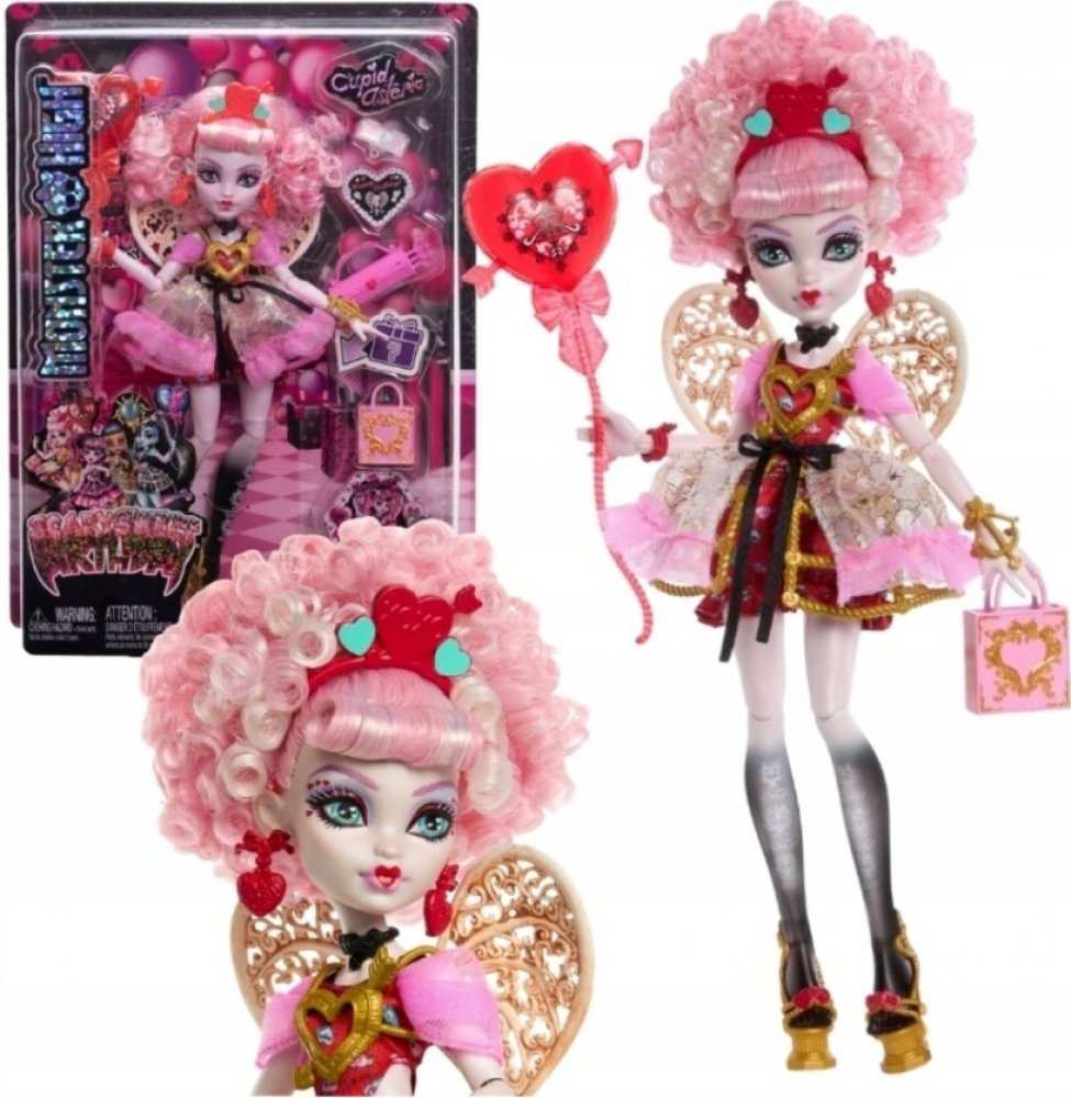 Draculaura pořádá děsivě sladkou narozeninovou párty a její kámošky z Monster High míří na tuhle oslavu století. Každá panenka z kolekce Scary Sweet Birthday je oblečená do parádně děsivého outfitu a přichází s balónky, pozvánkami, narozeninovými přáníčky, dárky a dalšími doplňky. Panenka Cupid Asteria je připravena „boo-gie“ tančit v děsivě krásném outfitu a s odpovídajícími doplňky. Cupid Asteria, vychovaná na hoře Olymp, miluje lásku. Má talent navazovat přátelství, rozdávat rady a vznášet se hvězdnou oblohou na svých kostěných křídlech. Její párty outfit je děsivě volánkový. Červené kalhotky s potiskem srdíček vykukují pod třpytivými šaty. Detail probodnutého srdce a náramek s kuší dodávají jejímu vzhledu zlatý nádech. Doplňky s narozeninovým motivem dotvářejí atmosféru strašidelně sladké oslavy. Například dárková taška pro Draculauru s překvapivým dárkem uvnitř. Díky stylovým doplňkům, jako je kabelka ve tvaru šípu a paletka očních stínů, si děti i sběratelé užijí spoustu zábavy při přípravě...