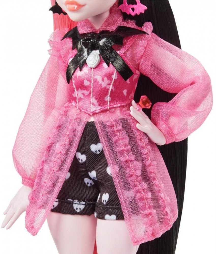 Zamilujte se do světově proslulé stylové ikony - Draculaury! Škola je opět v plném proudu a lehce přízrační studenti z Monster High dokáží dát školní uniformě pěkně na frak! Draculaura se prochází po chodbách Monster High jak po přehlídkovém mole ve famózních kraťasech s cool srdíčkovým potiskem a korzetové halence s průsvitnými rukávy, která je přesně podle poslední upírské módy.