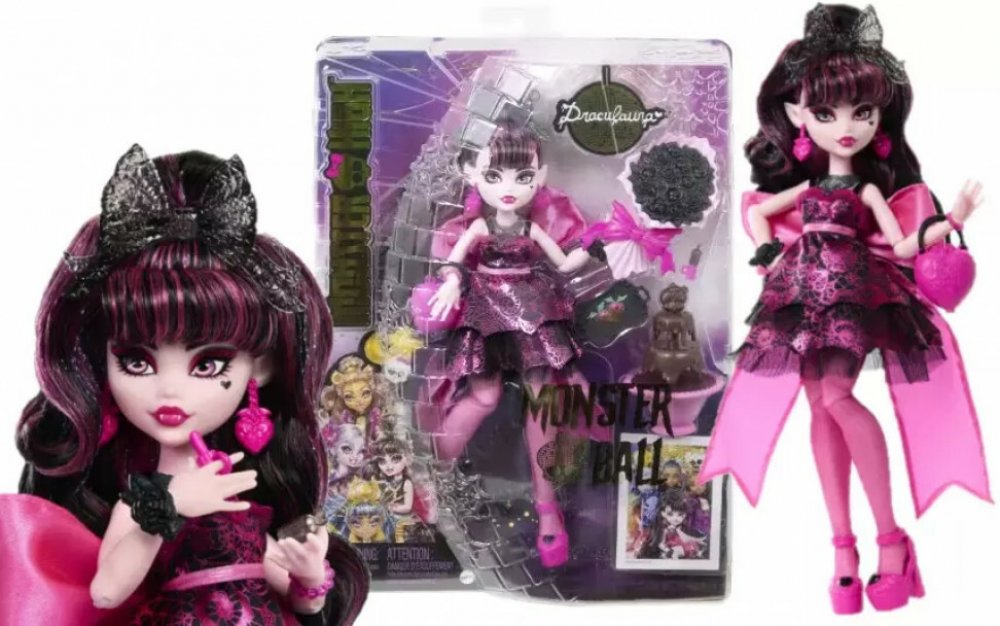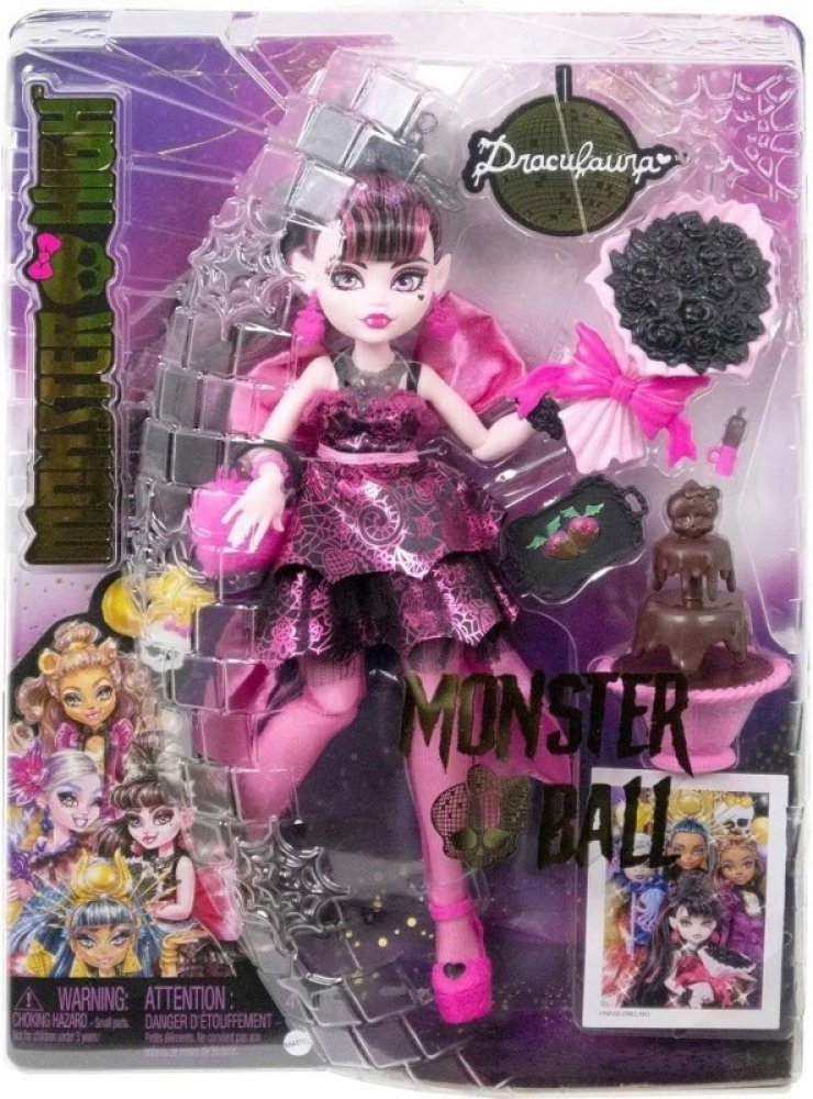 Panenka Draculaura přichází na Monster Ball v děsivě šik stylu! Rozjede párty, která jistě udělá parádu na strašidelném parketu Monster High. Každý upír potřebuje MSN: malé netopýří šaty. Látka se třpytí povrchovou úpravou připomínající pavučinu a efektní saténová mašlička dodává designu strašidelnou estetiku ve stylu glam. Draculaura okamžitě zabije svou kabelkou lámající srdce. Lze jej dokonce otevřít, aby se dovnitř vešla rtěnka pro zvláštní příležitosti. Její lesklé vlasy jsou upnuté do polokoku a závěsné náušnice, černá podprsenka, růžové punčocháče a lodičky na platformě dotvářejí její fantazijní styling. Další doplňky pro vyprávění příběhů udělají večer strašidelným: skupinová selfie na památku noci, kytice z černých růží, podnos šokujících jahod a čokoládová fontána.