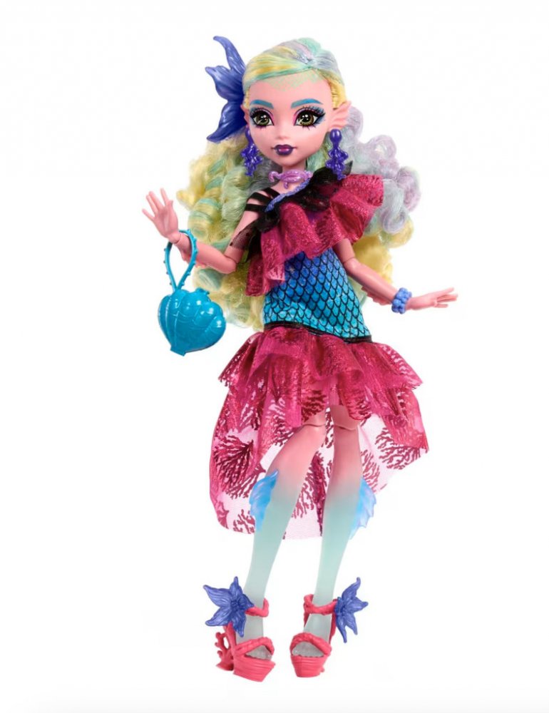 Panenka Lagoona Blue která jistě udělá parádu na strašidelném parketu Monster High. Šaty ve tvaru vějíře tohoto mořského monstra mají šupinatou podprsenku! Průhledné, zdobené korálovými detaily volánu u výstřihu a ve spodní části dodávají stylingu neuvěřitelně glamour. Její lesklé kadeře jsou posunuty na stranu pomocí báječné kytičky a náušnice ve tvaru chobotnice, náramek z korálků a sandály na platformě dotvářejí její kouzlo. Další doplňky pro vyprávění příběhů udělají večer strašidelným: skupinová selfie na památku noci, rekvizita pro fotografii medúzy a punč s příliv
