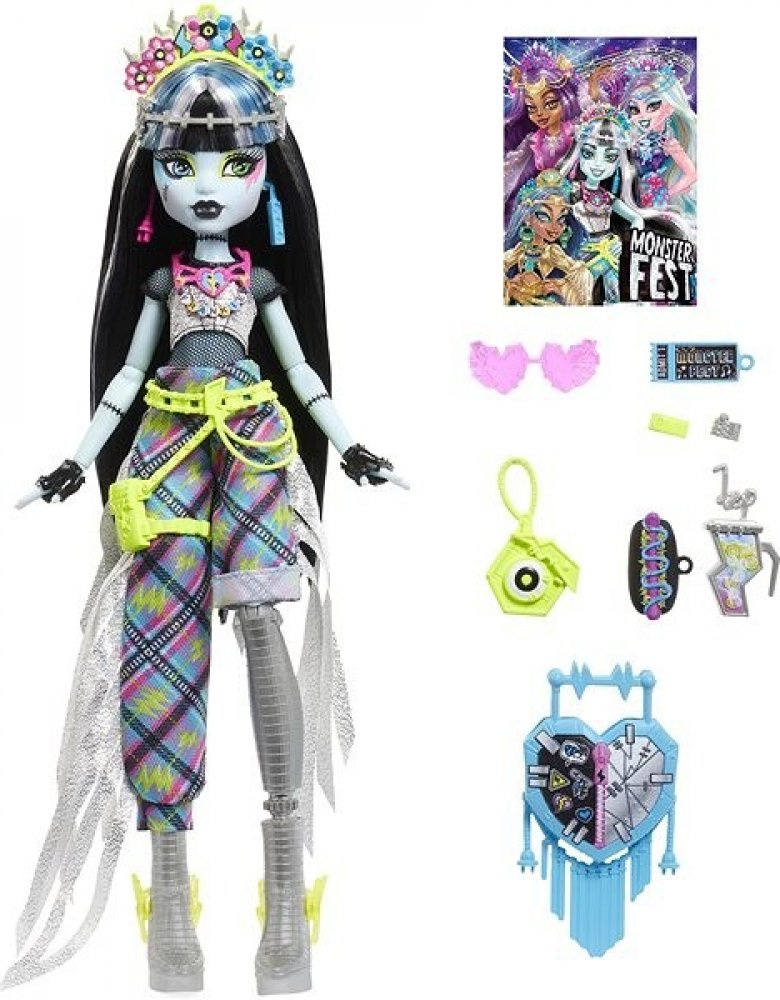 Připravte se na Monster Fest™ – nejvíce elektrizující hudební festival roku! Panenka Monster High™ Frankie Stein™ je připravena na nezapomenutelnou noc plnou tance, hudby a zábavných momentů s přáteli. Její originální a barevný outfit s mechanickou korunkou, síťovaným topem a asymetrickými kalhotami se stříbrnými třásněmi z ní dělá hvězdu každé dětské párty.