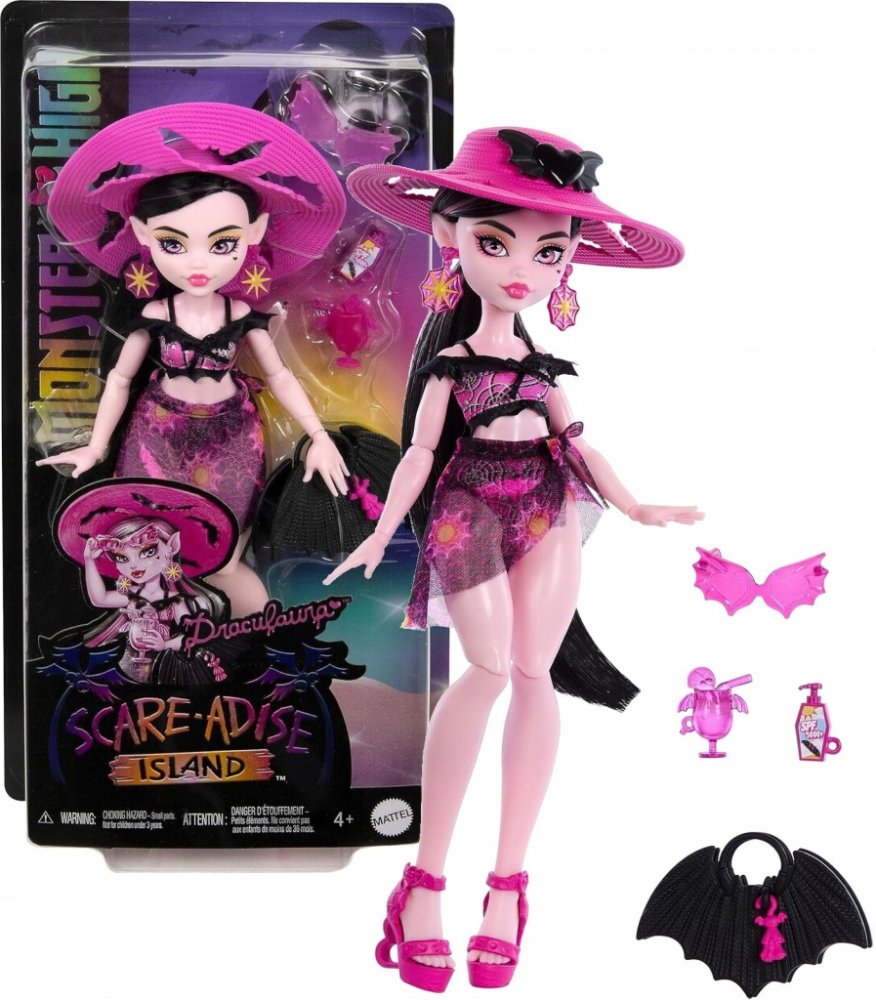 Panenka Draculaura se prezentuje v úžasném plavkovém plavce, který jistě upoutá pozornost každého fanouška Monster High. Její stůj je kombinací klasiky a strašidelné elegance. V odstínech růžové a černé s prvky bílé je tento kostým dokonalým vykreslením charakteristického stylu této postavy. Fankám série se bude líbit také její stylový klobouk, velké sluneční brýle a růžové doplňky, které se perfektně hodí pro letní dobrodružství na ostrově Straši-Ráj.