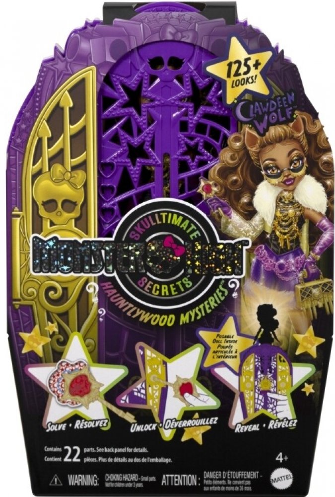 Odhalte tajemství Hauntlywoodu s Monster High! Vyřešte záhadu, otevřete brány Hauntlywoodu a odhalte kloubovou panenku Monster High. Děti se mohou stát strašidelnými detektivy a hledat stopy na mapě pomocí „kouzelného“ zvětšovacího klíče. Po cestě je čeká více než 19 úžasných překvapení, včetně třpytivých oblečků, děsivých rukavic a oslnivého šperku. Po skončení hraní si děti mohou uklidit monsterku, oblečení a doplňky do hvězdného šatníku, který je ideální nejen pro ukládání, ale i pro vyprávění příběhů. Každá panenka se prodává samostatně v závislosti na dostupnosti. Panenky neumí samostatně stát. Barvy a vzhled výrobku se mohou lišit.