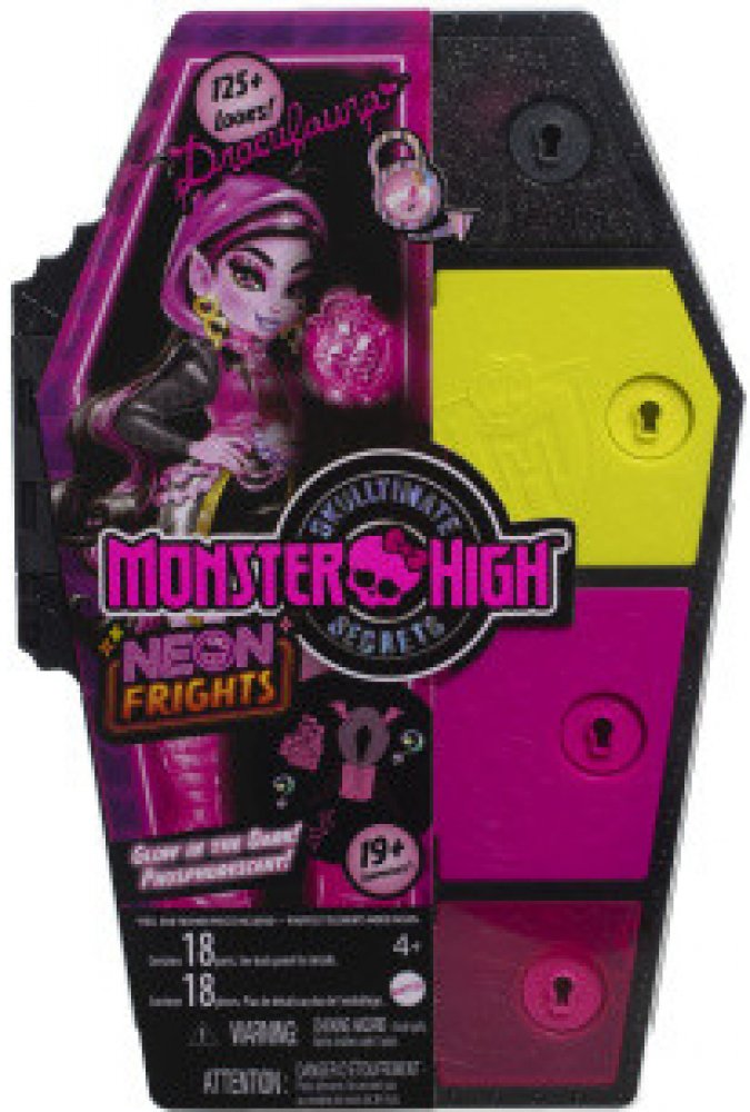 Kdo se rád bojí a kdo miluje napětí ten musí milovat i pořádná překvapení! Panenky z řady Monster High™ Skulltimate Secrets™ přichází v nové edici a nabízejí při rozbalování to nejnapínavější očekávání korunované monstrózním překvapením! V každém boxu, který má ikonický tvar rakve, čeká tajemná Monster High™ panenka a balíčky s více než 21 překvapeními! Technologie Color Reveal™ postupně odhalí identitu monsterky a balíčky plné překvapení dodají stylové i tematické oblečky i cool doplňky. Ohebné klouby každé panenky i originální vzhled nahrávají nekonečným možnostem dětské fantazie. Panenky se prodávají samostatně v závislosti na dostupnosti. Panenky nemůžou stát samostatně. Barvy a provedení se mohou lišit.