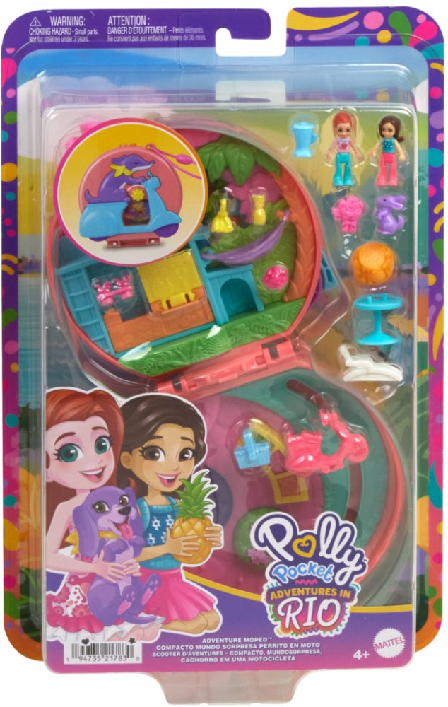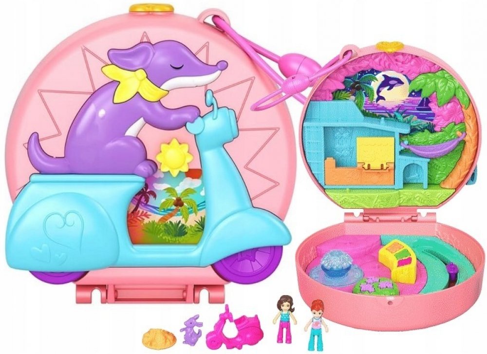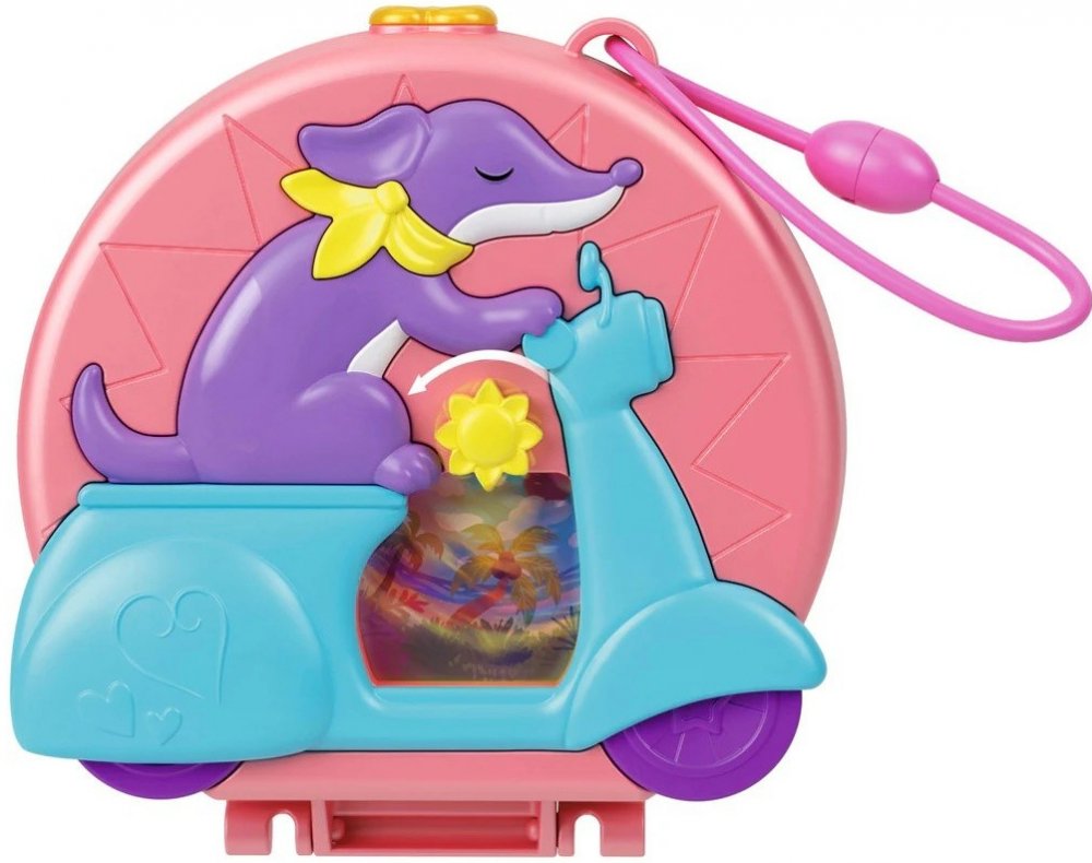 Tento rozkošný Polly Pocket kufřík má exteriér mopedu pro štěně se zábavnými nemotornými koly.