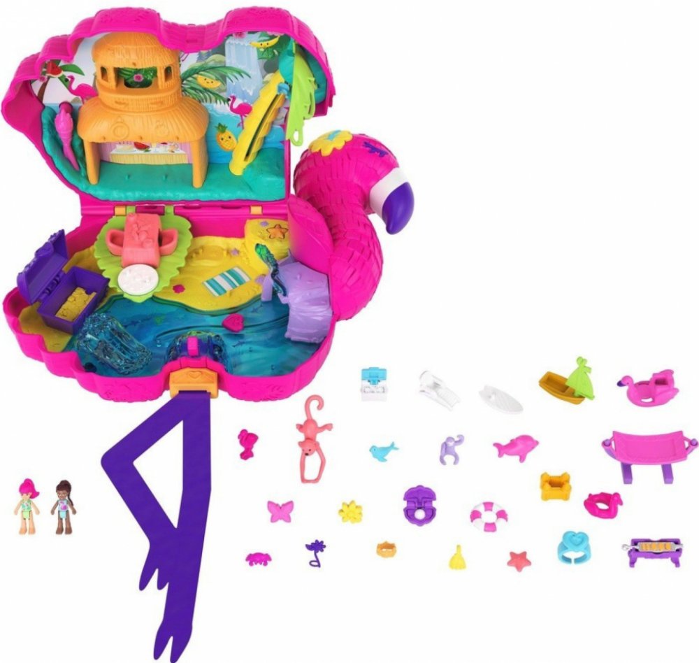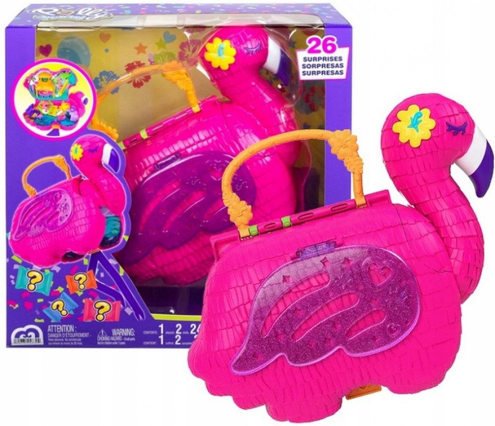 Začněte tropickou zábavu s hrací sadou Polly Pocket Flamingo Party! Tato velká krabice má tvar roztomilého plameňáka a je vybavena držadlem, které je ideální na cesty! Stačí zatáhnout za plameňákovy nohy a sledovat, jak ze sady vypadávají barevné konfety a 26 překvapení. Některá překvapení jsou zabalená pro ještě větší vzrušení! Děti mohou měnit uspořádání různých částí hrací sady, protože mnoho p...