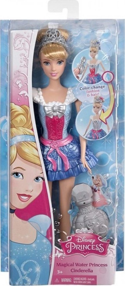 Čaruj s barvami a svým oblíbeným princeznám teď jednoduše můžeš měnit barvy šatů a vlasů. Popelka, Aurora a Ariel jsou oblečeny do krásných koupacích šatů, které podtrhují jejich osobnost a každá z nich má u sebe svou kouzelnou nádobu. Naplň zázračnou dózu vodou, postříkej panence šaty, v případě mořské panny Ariel ploutev a sleduj, co se bude dít. Během chvilky se barvy začnou měnit. Zkus postříkat princezně i vlasy, změní se také. Když panenka uschne, barva se vrátí na původní a ty můžeš začít znovu. Posbírej všechny Disney princezny, které mění ve vodě barvu a uspořádej pro ně bazénovou párty plnou proměn. Věk: 3+ Výška: 29 cm