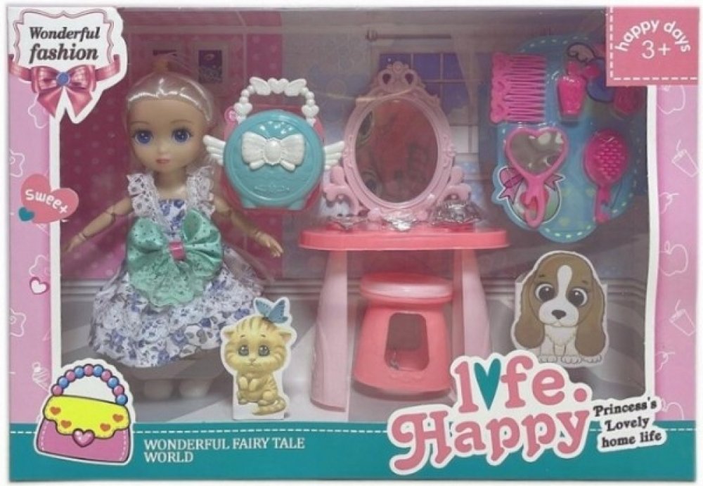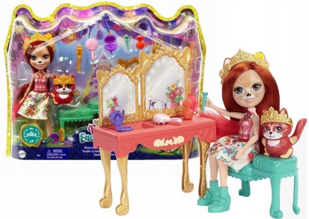 Enchantimals set - panenka Fabrina Fox s toaletním stolkem Beauty Secrets a doplňky. Hračka umožňuje napodobit podvodní ošetřovnu z pohádky Enchantimals, kterou děti dobře znají. Panenka je oblečena v klasickém stylu. Na hlavě má korunku a liščí uši. Příslušenství zahrnuje toaletní stolek s grafikou kopírující zrcadlo, sedátko, postavičku lišky, kosmetické potřeby (např. parfém) a žezlo. Sada je i...