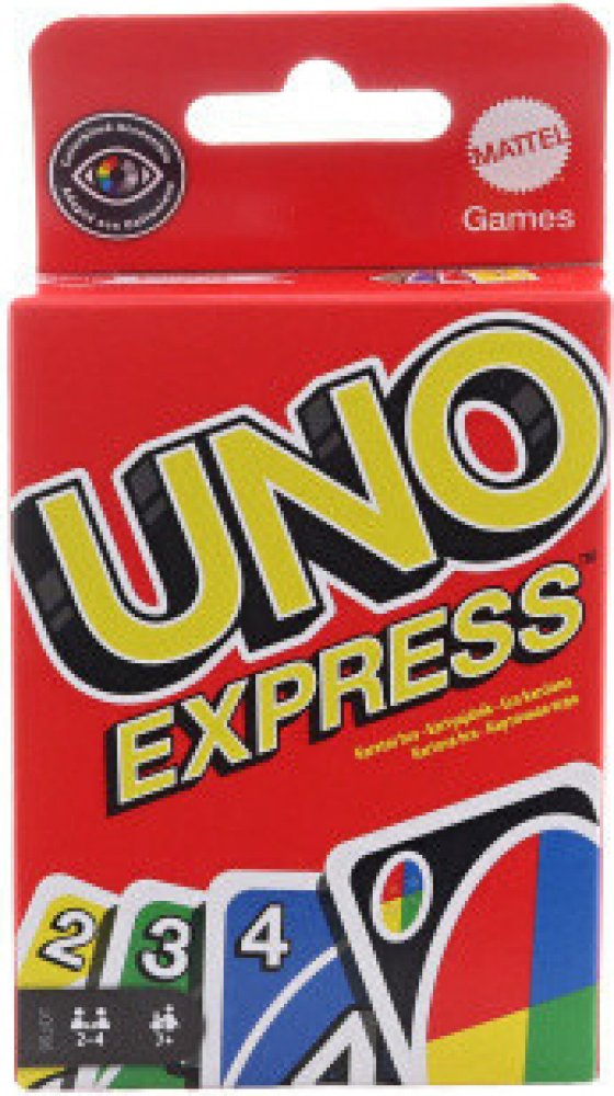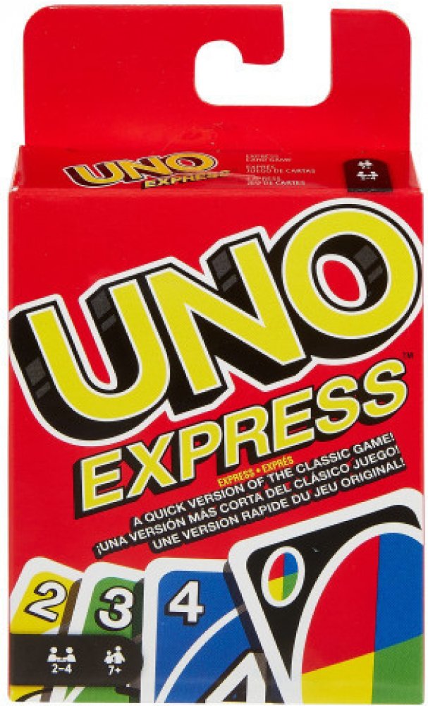 Uno express – UNO je klasická a oblíbená karetní hra. UNO Express vychází z klasické karetní hry UNO, ale je rychlejší. Hráčům umožňuje dokončit kola rychleji! Díky menšímu počtu karet je tato verze UNO přenosná a snadno si ji vezmete s sebou na cesty. Pravidla hry jsou stejná jako u hry Uno klasik. Obsahuje standardní karty + měniče (plní funkci, která vám pomůže porazit vaše protivníky). Až budete mít poslední kartu nezapomeňte zakřičet „UNO!“ První hráč, který se zbaví všech karet v ruce je vítěz Hra je pro 2 až 4 hráče. Obsahuje 56 karet a návod.