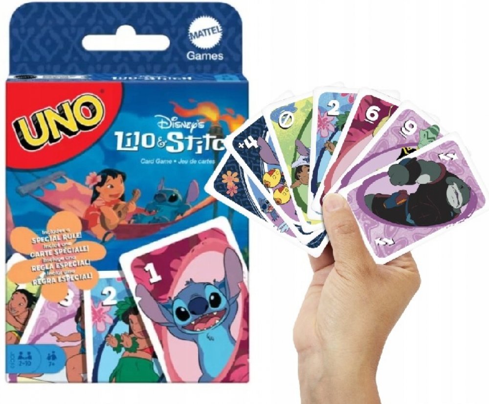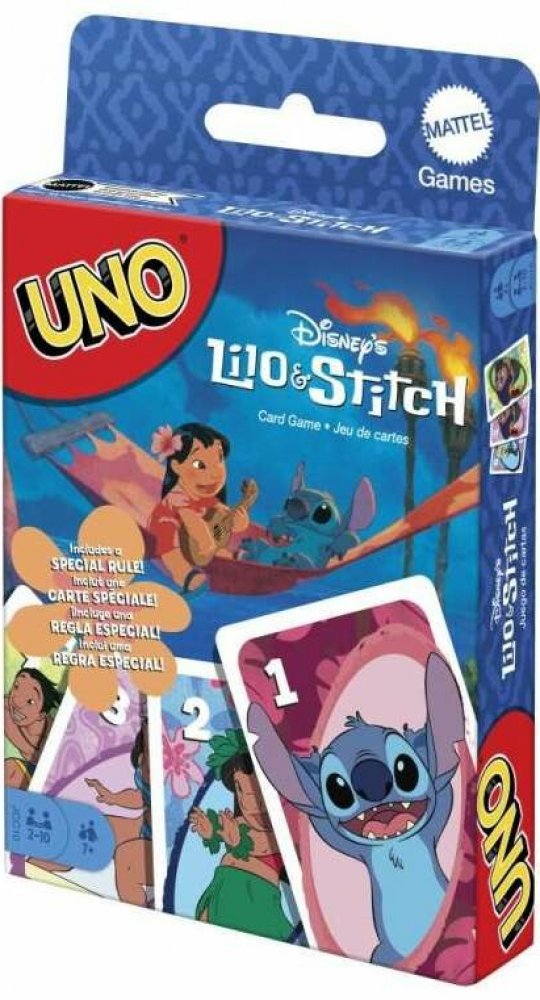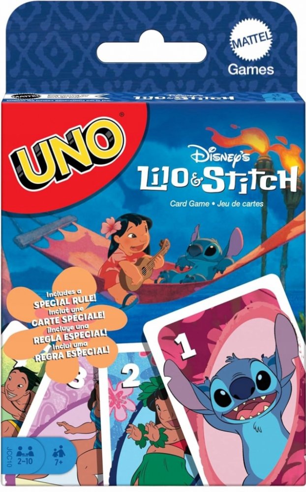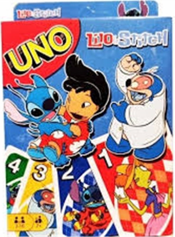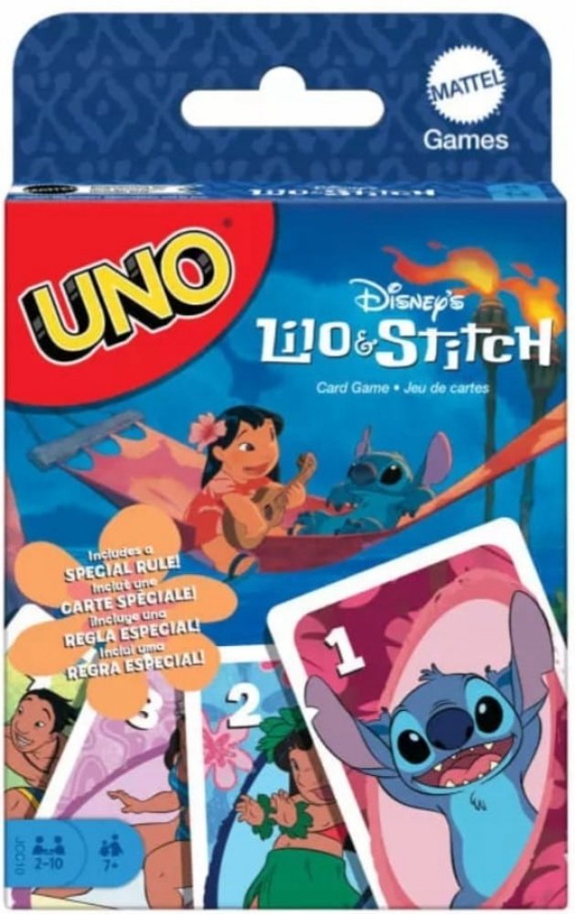 Fanoušci příběhů Lilo a Stitch si zamilují tuto tematickou UNO karetní hru. S balíčkem karet, inspirováným oblíbenými postavami a scénami z Lilo a Stitch, se hráči snaží spojit barvy a čísla jako v klasické hře UNO. Nechybí ani speciální karta s pravidlem "Ohana", které znamená, že každý hráč bude mít v ruce čtyři karty! A když vám zbude poslední karta, nezapomeňte zakřičet "UNO!"