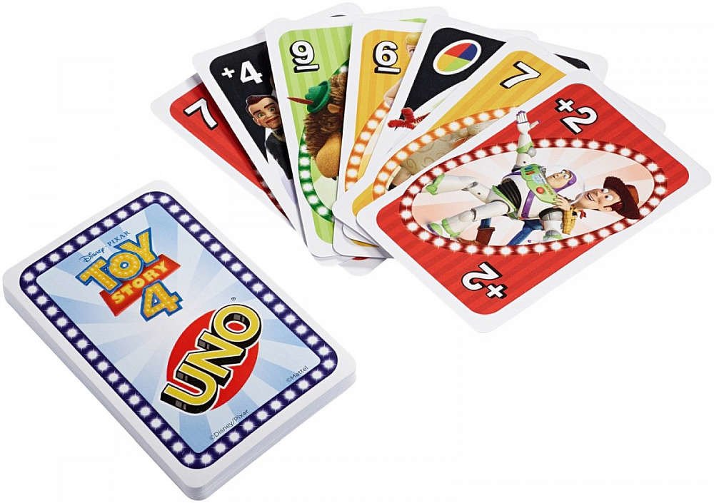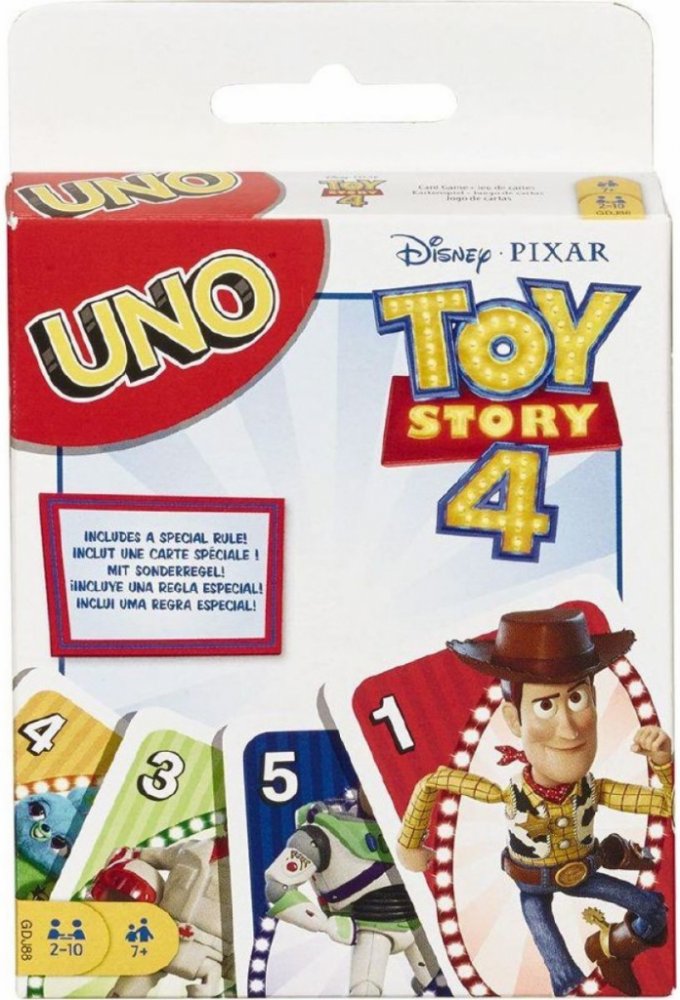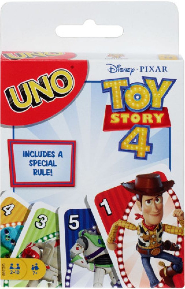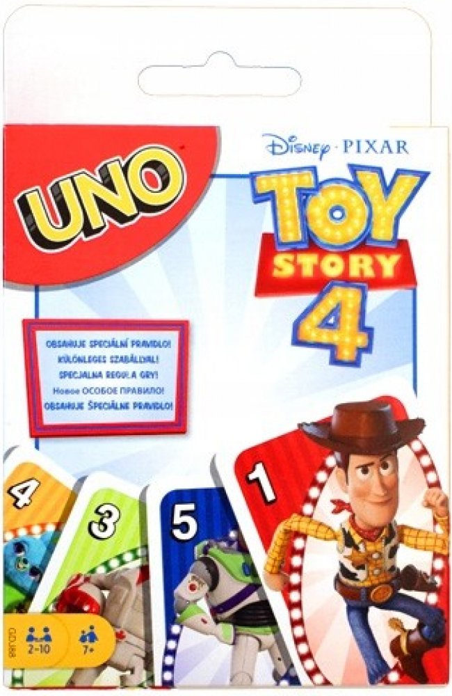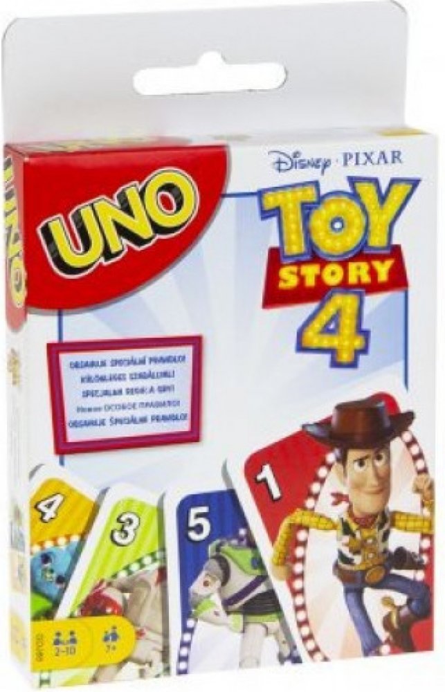 Vaše oblíbená hra UNO™ nyní přichází ve zcela novém designu. Všechny karty nyní zdobí rozkošné tematické obrázky z filmu Toy Story 4: Příběh hraček!