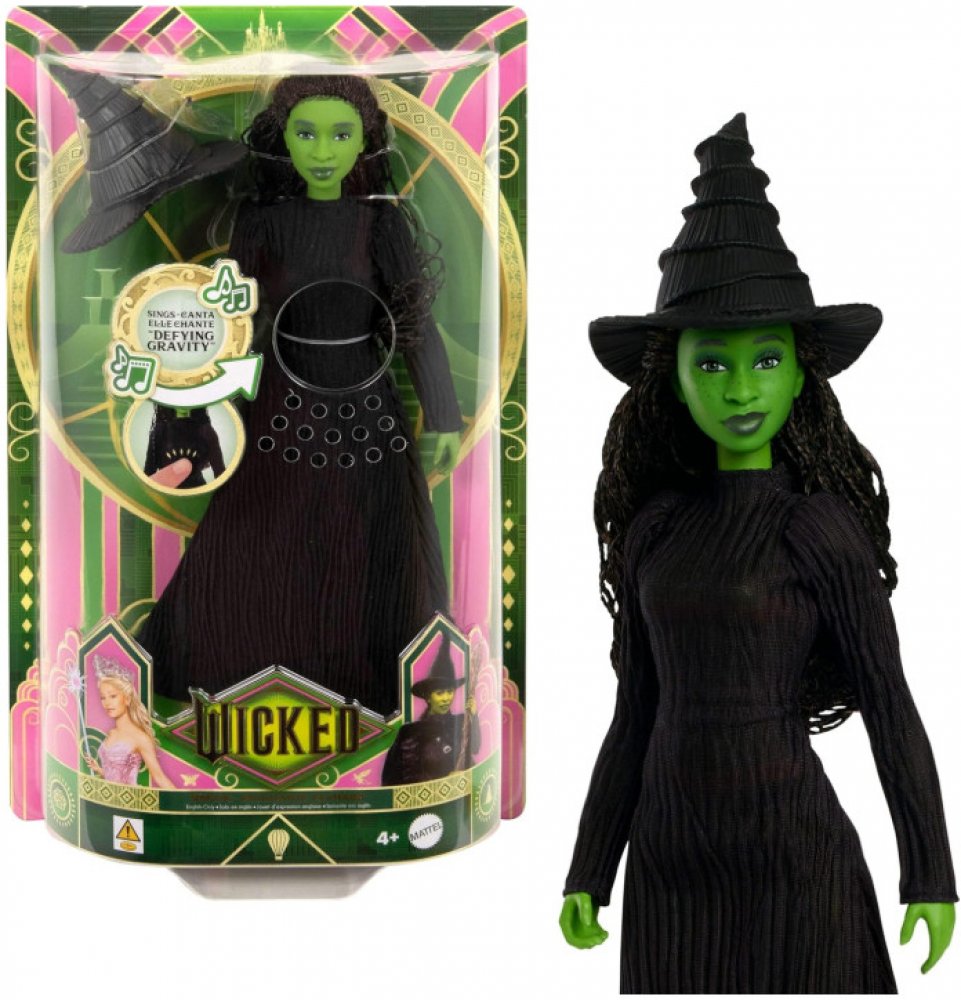 Ponořte se do světa muzikálu s panenkou Elphaba, která vám přináší úryvky z ikonické písně přímo ze slavného filmu Čarodějka. Tato zpívající módní panenka zachycuje odvážnou studentku Univerzity Šiz v jejím charakteristickém černém outfitu s špičatým kloboukem a botami na vysokém podpatku. Její zelená pokožka a dlouhé zapletené vlasy dokonale dotvářejí autentický vzhled inspirovaný filmem. Stačí stisknout tlačítko a můžete si zazpívat společně s ní! Ideální dárek pro fanoušky muzikálů, kteří ocení nejen její vzhled, ale i zvukové efekty. Panenka neumí samostatně stát, proto jí připravte vhodné místo k vystavení nebo hraní.