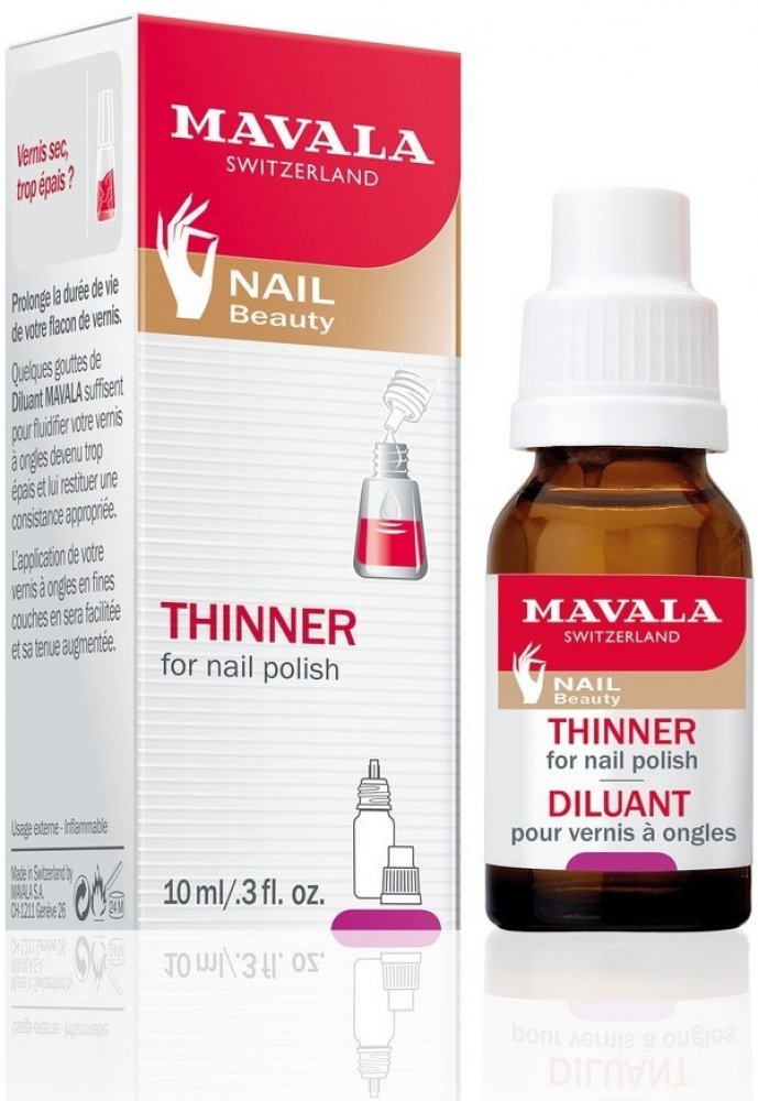 Ředidlo laku na nehty pro snadnější aplikaci barevného laku prodlužuje trvanlivost laku na nehty. Přidejte 1 až 2 kapky Mavala Thinner dokud nezískáte požadovanou konzistenci vašeho laku. Špatně se nanášející, rychle se odlupující lak. Problém nemusí být v jeho kvalitě ale konzistenci. Přípravek Thinner používejte pouze v případě potřeby. Přidávejte ho do laku na nehty aspoň 20 minut před aplikací...