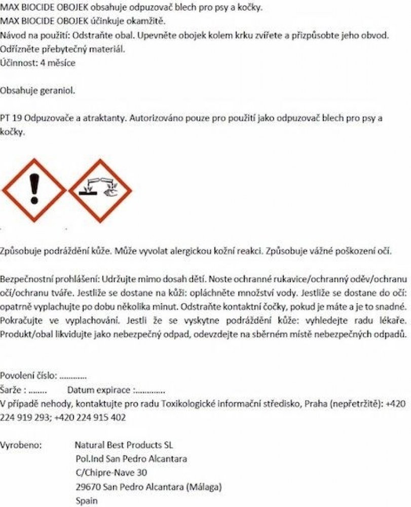 Složení: Geraniol 13 % (Geraniol má preventivní a léčebný účinek na vnější parazity, klíšťata a blechy), LDPE 87 %.