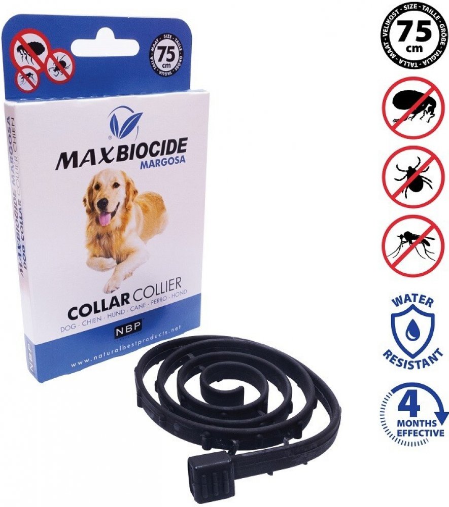 Antiparazitní obojek dlouhodobě působící proti blechám, klíšťatům a komárům. Max Biocide Dog Collar Obojek s délkou 75 cm je určený pro velké psy. Působí na bázi rostlinného extraktu z margosy – látky z tropického stromu zederachu indického, která má repelentní a biocidní účinky. Obliba této látky roste, protože je vhodný i pro zvířata, která jsou citlivá na chemické repelenty a mohou ji používat ...
