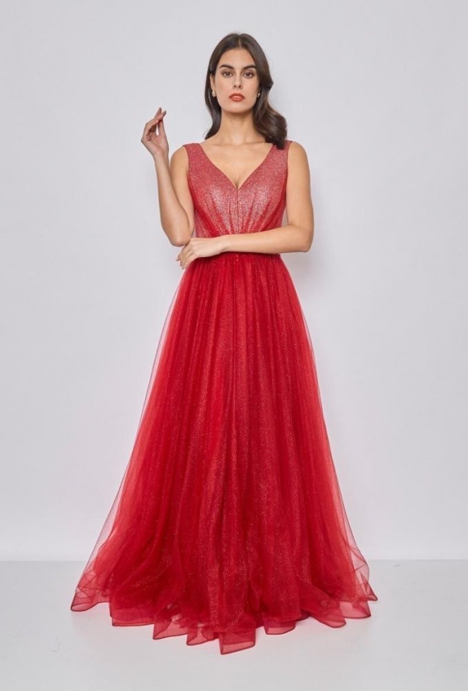 Okouzlující dlouhé večerní šaty v sytě červeném odstínu jsou ideální volbou pro ženy, které chtějí zazářit. Jemně třpytivý materiál dodává šatům luxusní vzhled a krásně odráží světlo při pohybu. Výstřih do V lichotí dekoltu, zatímco projmutý pas zvýrazňuje ženskou siluetu.
