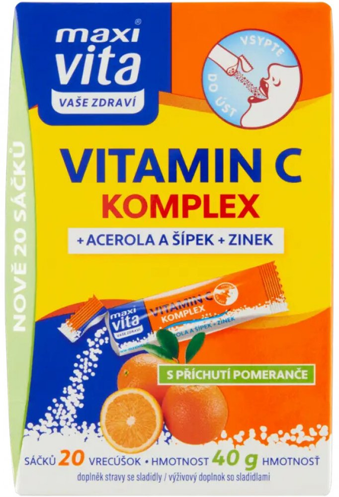 Maxi Vita® Vitamin C komplex + Acerola a šípek + Zinek je moderním doplňkem stravy v praktických jednorázových sáčcích, které umožňují vysoce komfortní užívání bez nutnosti zapíjení.