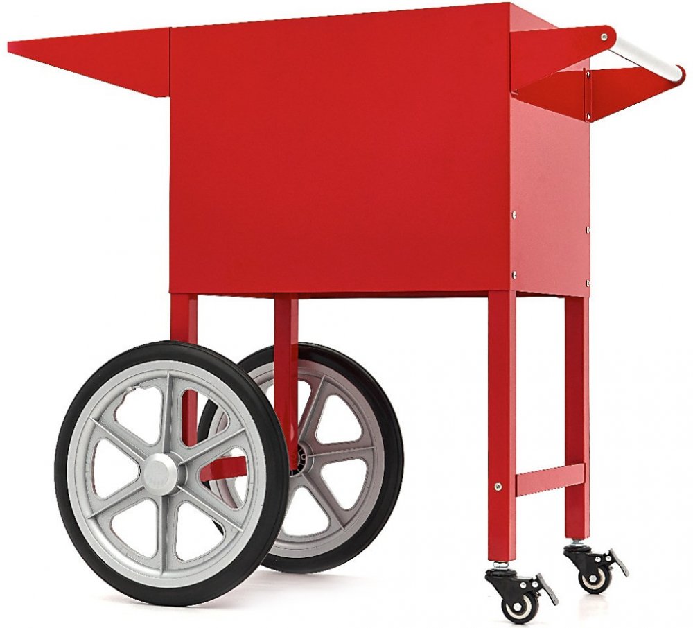 Chcete také všude chodit s popcornovačem? S tímto praktickým vozíkem můžete. Vozík se dvěma velkými a dvěma malými koly lze snadno sestavit. Vozík sestavte, umístěte na něj svůj popcornovač a můžete začít chodit. Když budete chtít vozík položit, stiskněte brzdu na zadních kolech a vozík se zastaví.