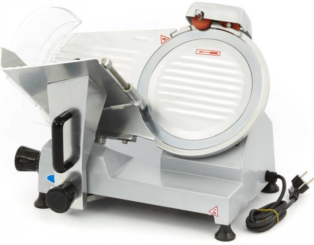 Některá masa lze krájet na silné plátky, zatímco například šunku nebo carpaccio je nejlepší krájet na tenké plátky. Proto můžete na tomto kráječi nastavit tloušťku řezu přesně na šířku, kterou potřebujete. Bezpečná práce s kuchyňskými nástroji, jako je tento, je v profesionální kuchyni důležitá. Motor má vestavěnou bezpečnostní funkci a díky jeho konstrukci se ruce nedostanou do blízkosti čepele. Při častém používání se může čepel otupit. Proto je kráječ vybaven nástavcem pro ostření. Jakmile nástavcem otočíte, čepele projdou brusnými kameny a nůž bude opět ostrý. Po nabroušení je vhodné kráječ vyčistit, aby se jemná zrnka z kamenů nedostala do potravin.