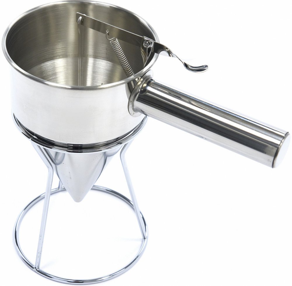 Plníte formy na pečení, připravujete palačinky nebo lívance nebo naléváte těsto do forem na košíčky a muffiny bez nepořádku? S tímto profesionálním dávkovačem těsta to zvládnete velmi snadno. Dávkovač těsta je vyroben z nerezové oceli a má objem 1,6 litru. Je ideální pro snadné a dokonale dávkované nalévání těsta do nejrůznějších forem na pečení. S tímto kuchyňským pomocníkem pracujete nejen velmi elegantně, ale také hygienicky, protože nepřijdete do kontaktu s těstem.Praktické odměrné tlačítkoTento robustní dávkovač těsta má masivní povrchovou úpravu a vydrží dlouhá léta. Díky plášti z nerezové oceli vydrží dávkovač i hrubší zacházení. Aby bylo plnění pečicích forem ještě snazší, je tento dávkovač těsta vybaven stojanem na nalévání těsta. Pomocí dávkovacího tlačítka určíte, kolik těsta se má použít.Díly lze mýt v myčce nádobíAby se zabránilo ulpívání zbytků těsta, doporučujeme dávkovač těsta po každém použití důkladně vyčistit. Čištění dávkovače těsta je díky materiálům z nerezové oceli snadnou záležitostí. Díly můžete rozebrat a vyčistit v myčce nádobí. Po vyčištění osušte všechny části měkkým hadříkem. Poté můžete dávkovač těsta opět složit a je připraven na další práci. Robustní a pevné provedení Vybaveno dávkovacím knoflíkem Součástí je trojnožka pro lití těsta Velmi odolná konstrukce Hygienický design Specifikace výrobku Čistá hmotnost: 2 kg Rozměry výlevky: rozměry: 8 mm Množství těsta: 1.objem: 3 litry Rozměry zařízení: 1,5 mm: Š200 x D150 x H210 mm Čistá hmotnost: 2 kg Výstupní rozměry: rozměry: 8 mm Množství těsta: 1,3L Rozměry spotřebiče: B20 x D15 x H21cm
